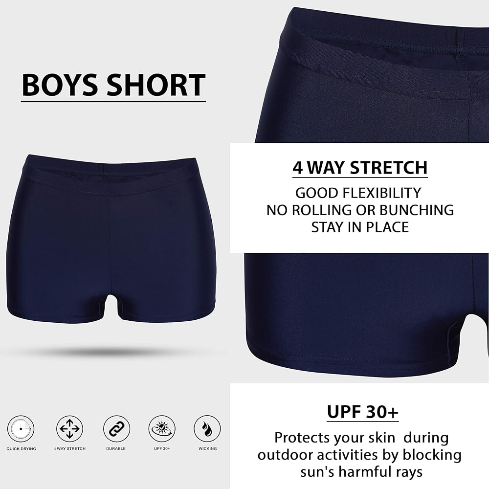 • Full-coverage swim shorts boast a clean design and boyshort-like appearance. Fitted short has a mid rise, elastic waistband, and center seam on the front and back. Hits at the upper thigh