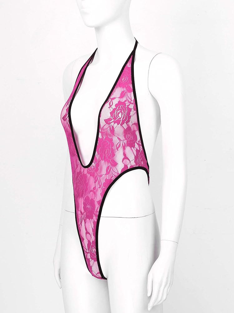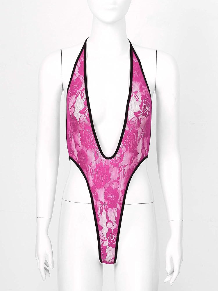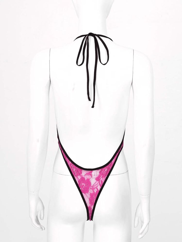 - Women Halter Lace-up Deep V Neck Monokini See-through Lace Lingerie Swimwear