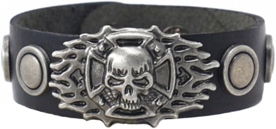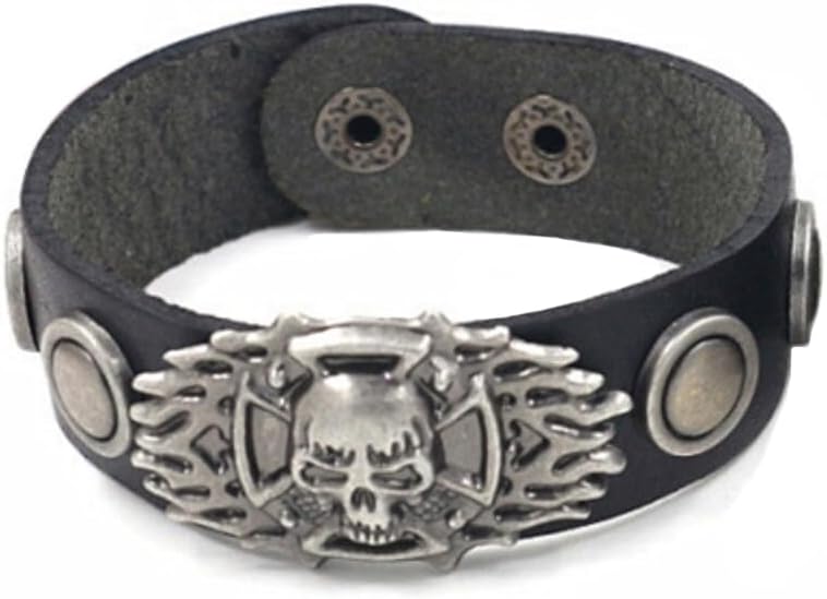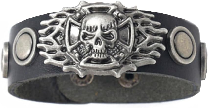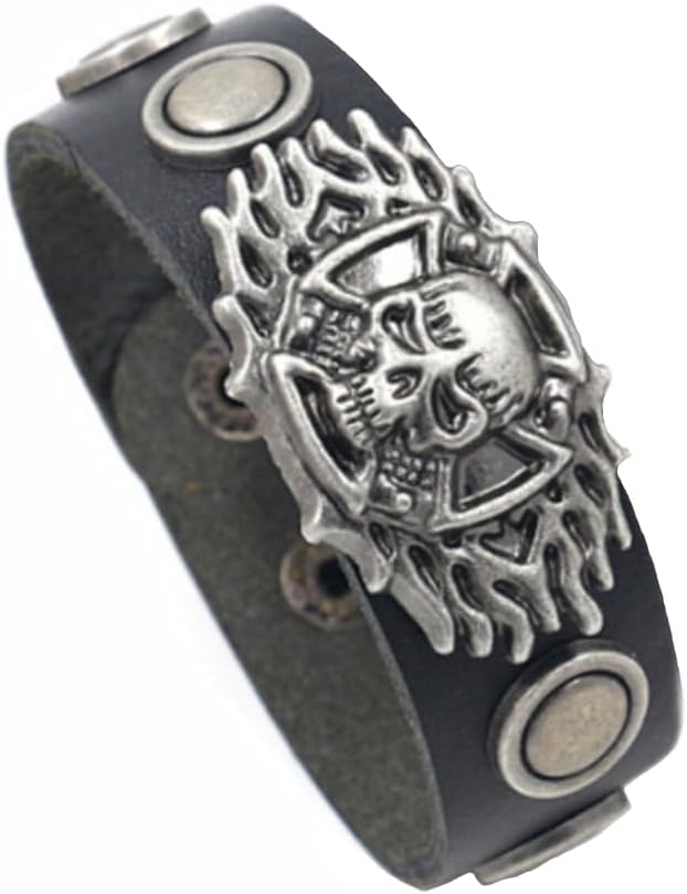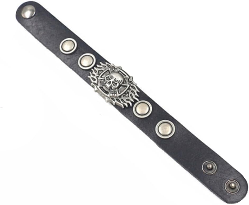 Berné Black Leather Skull Bracelet for Mens Boys Teens, Real Boho Leather Stainless with Steel Ornaments 21mm Wide Punk Biker Motorcycle Wrap Wristband Bracelet