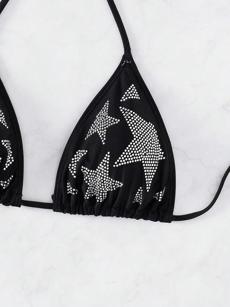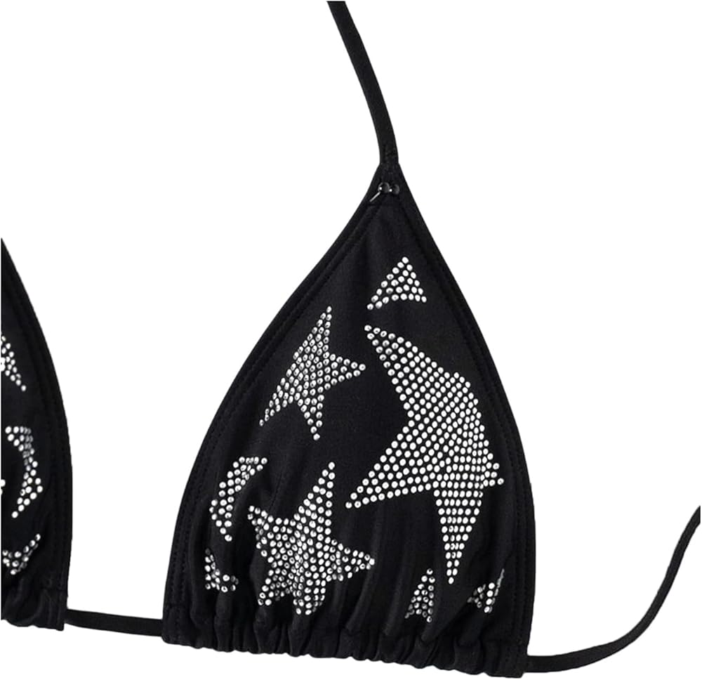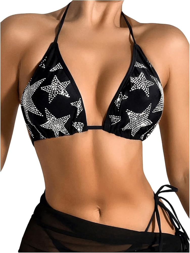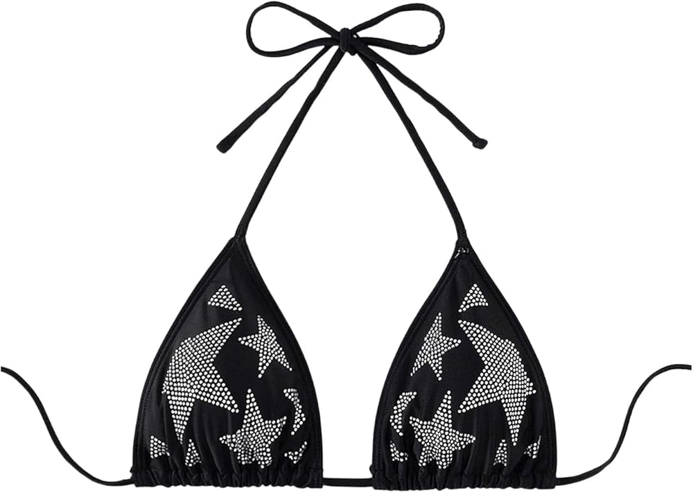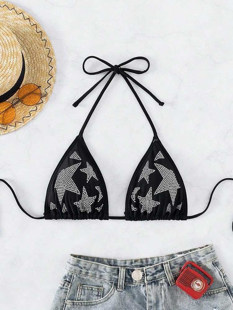 - With rhinestone embellishments on a geometric star print, this triangle bra tie-back offers a chic beach vibe.