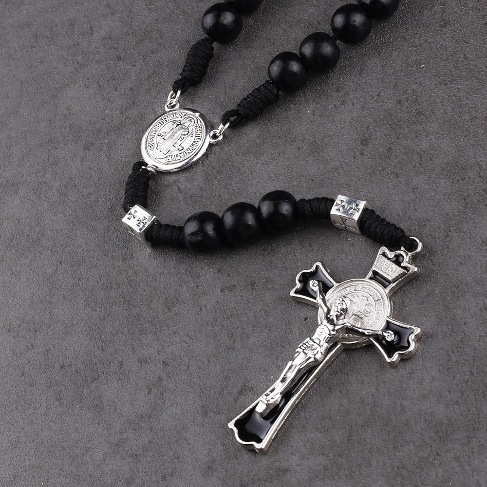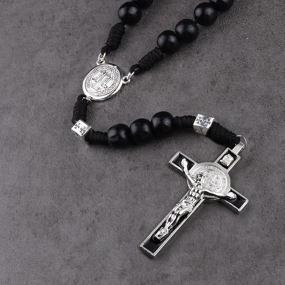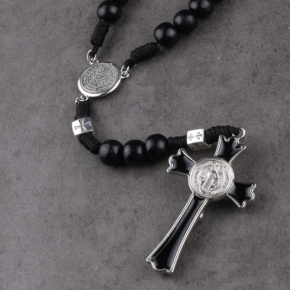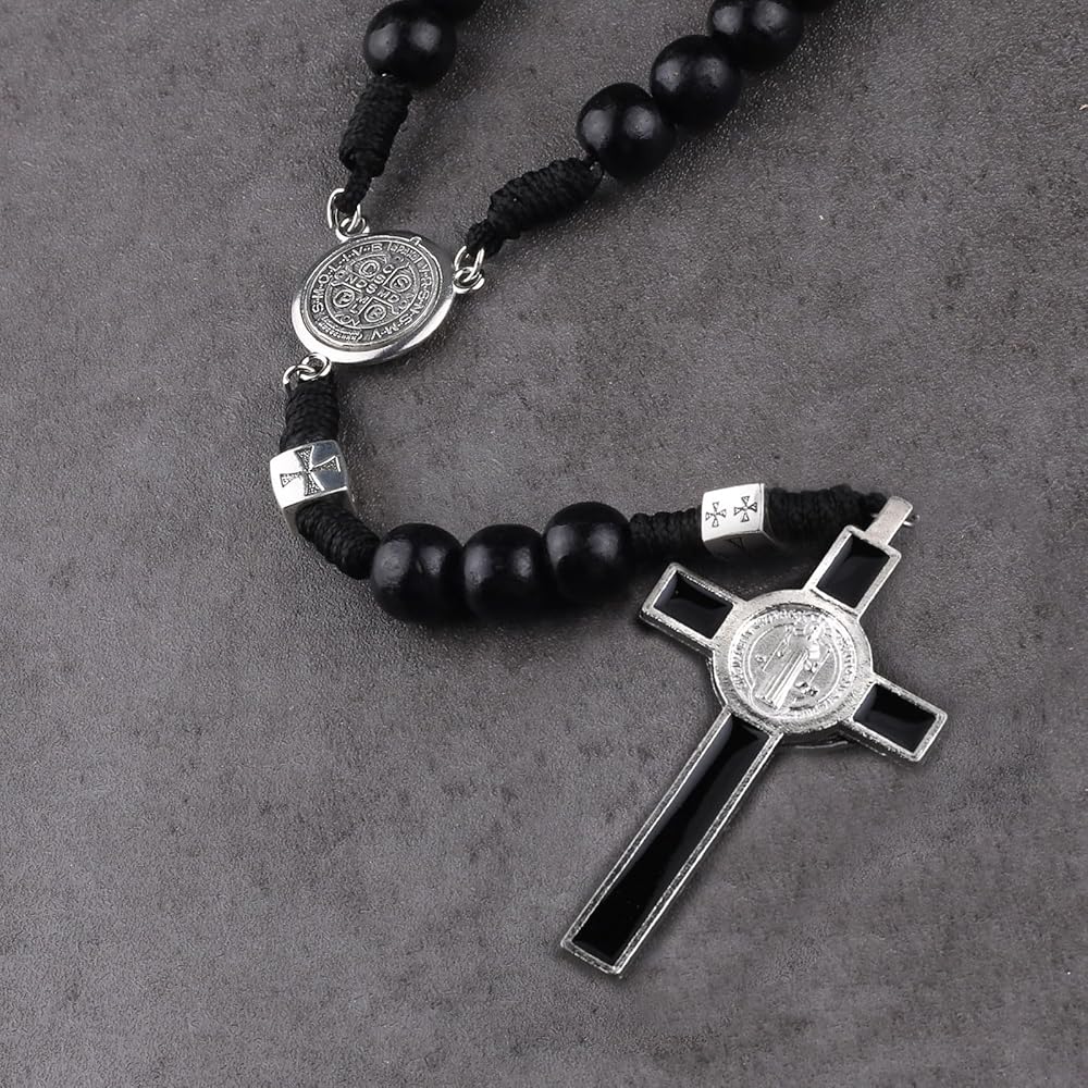 Luomu حبات المسبحة الخشبية السوداء مع خرز سانت بنديكت المعدني وقلادة مسبحة مع ميدالية وصليب للرجال