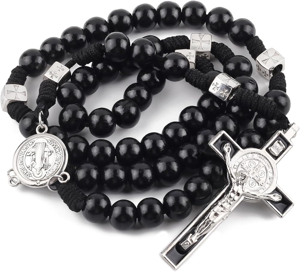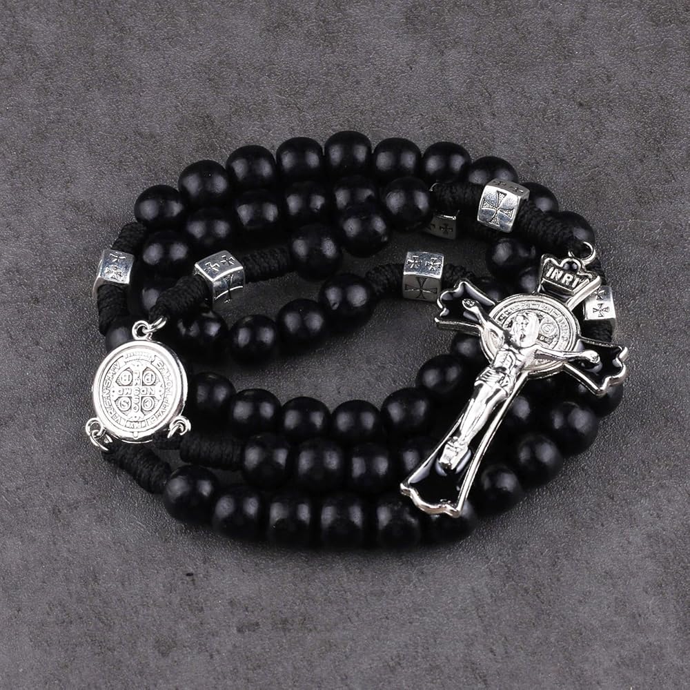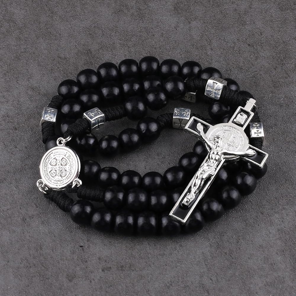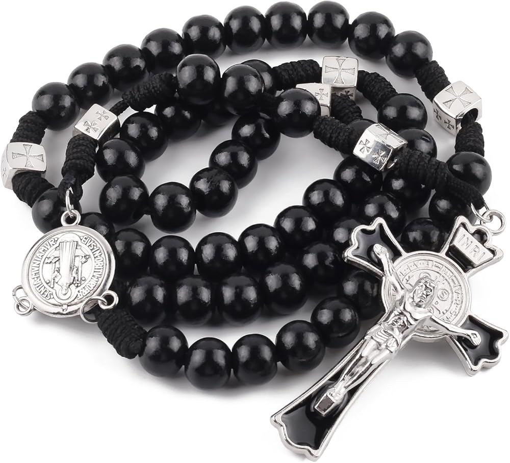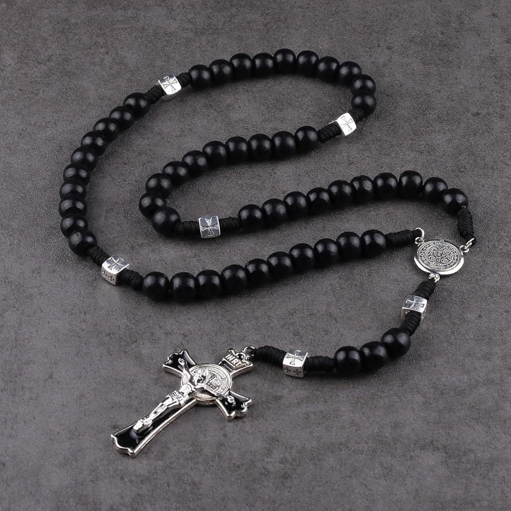 Luomu حبات المسبحة الخشبية السوداء مع خرز سانت بنديكت المعدني وقلادة مسبحة مع ميدالية وصليب للرجال