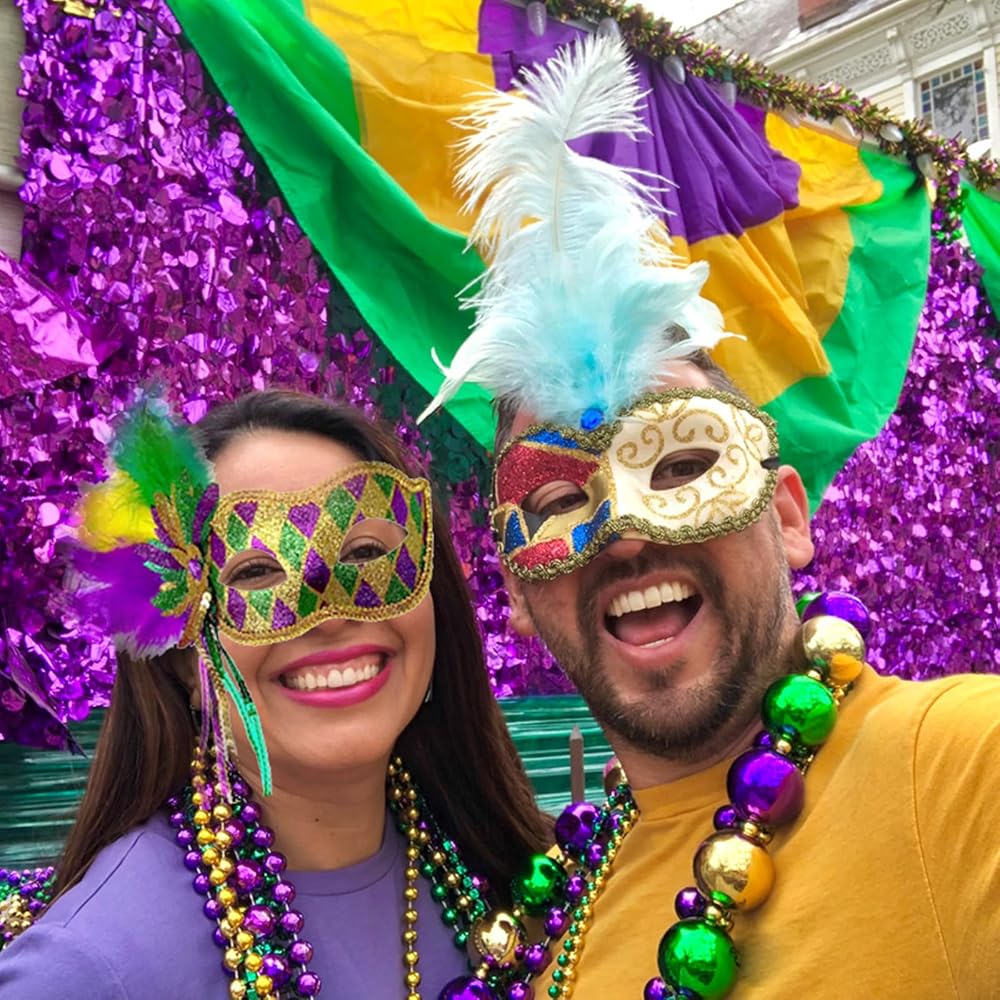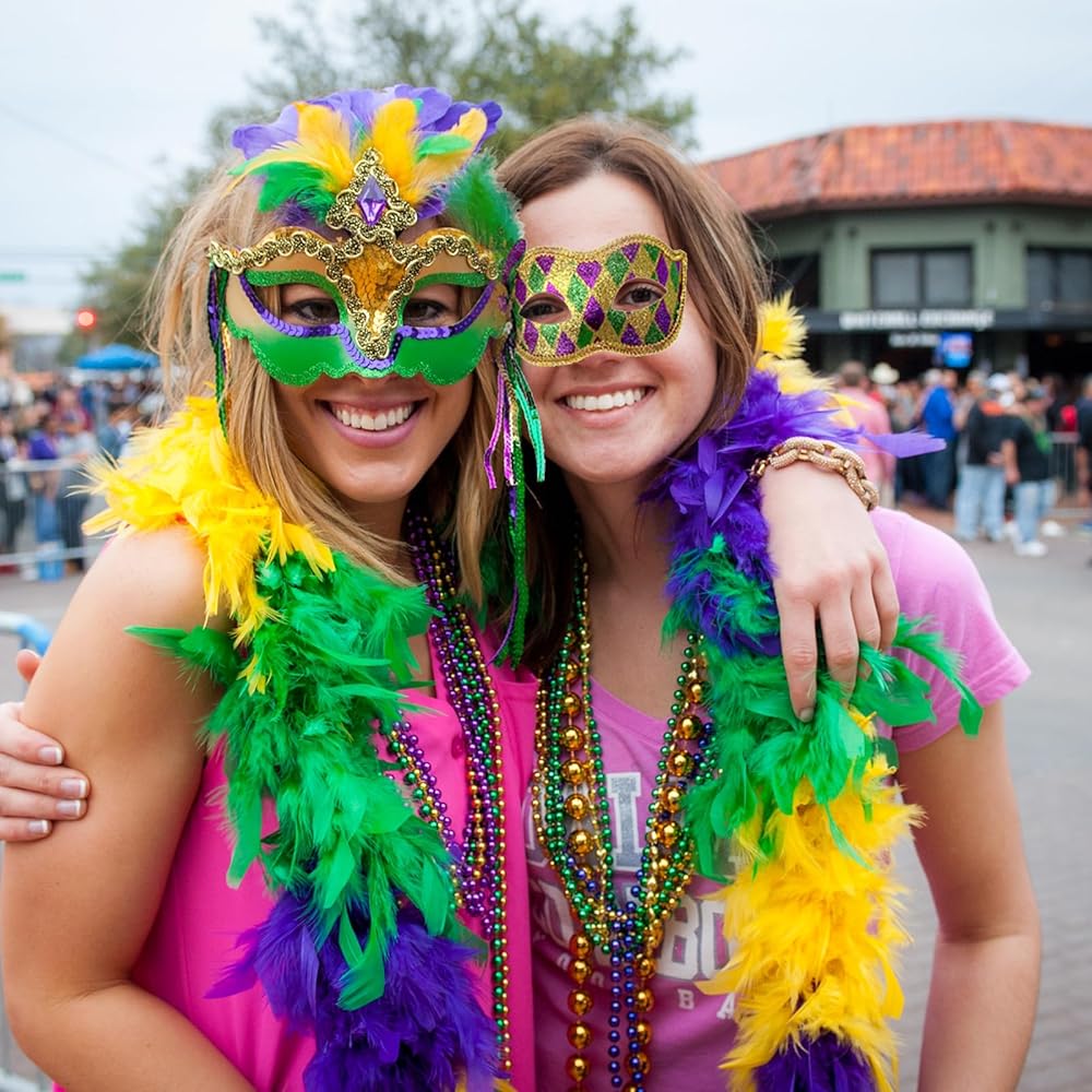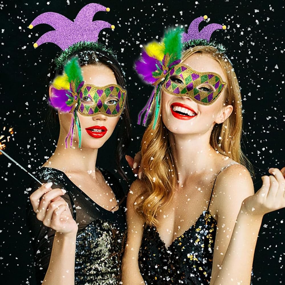 Mardi Gras Themed Design: Mardi Gras mask with feather is designed with glitter sequins and matched with classic carnival colors such as purple, yellow and green.mardi gras mask costume can be easily matched with different styles of clothing