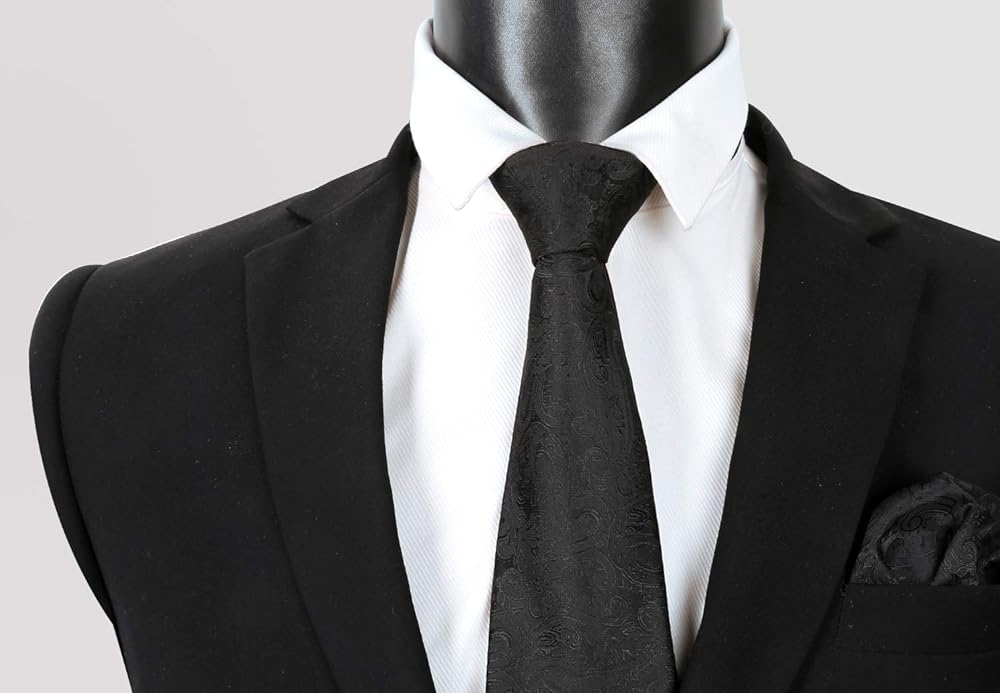 عرض ربطة العنق: 3.5 بوصة (9 سم)؛ طول ربطة العنق: 59 بوصة (150 سم)؛ مقاس المنديل: 10 بوصة × 10 بوصة (25 سم × 25 سم)