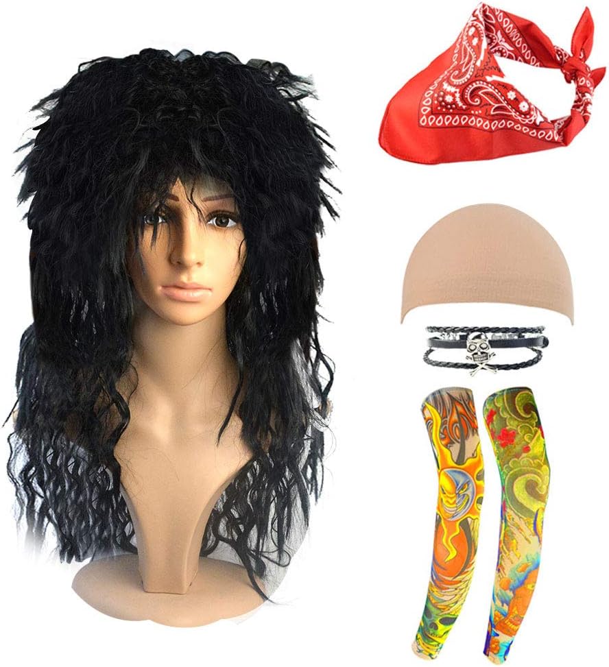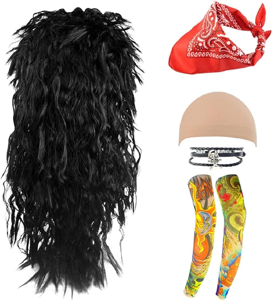 تتضمن مجموعة أزياء الروك ستار على: 1 × 80 /90 ثانية شعر مستعار معدني ثقيل، 1 × قبعة شعر مستعار، 2 × أكمام وشم مؤقتة، 1 × منديل و1 × سوار جمجمة.