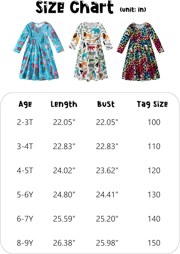 المميزات: فستان للفتيات الصغيرات بأكمام طويلة، فستان كاجوال للفتيات، أنماط تحتوي على حورية البحر المفضلة للفتيات والفراشة والديناصور والحيوانات والفهد والمصاصة والحلوى، سوف تحصل فتاتك الجميلة على الكثير من الإطراء عند ارتدائها!