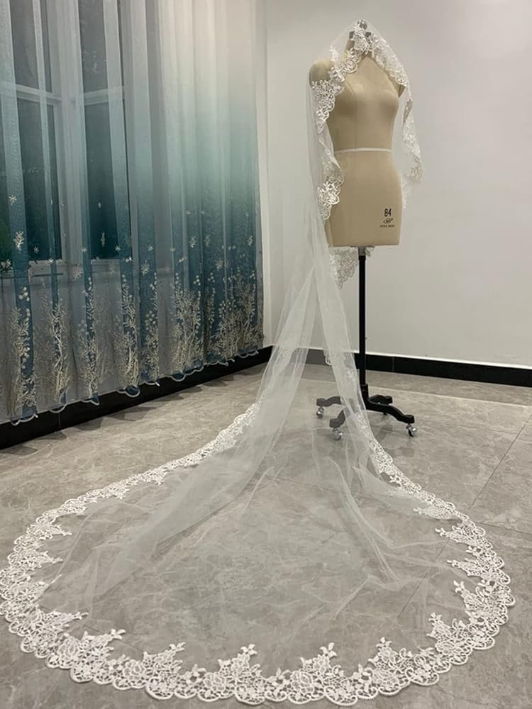 طرحة زفاف من الدانتيل الكاتدرائية من HEREAD للعرائس، حجاب زفاف طويل بطول مصلى من التول بطبقة واحدة 118 بوصة، إكسسوارات للشعر مع مشط (طول 118 بوصة أبيض)