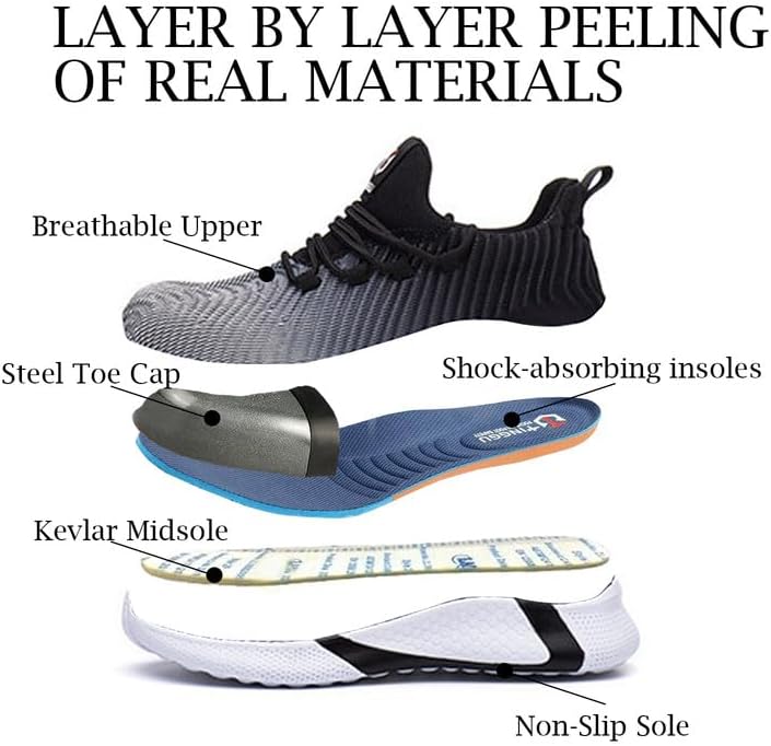• 【Puncture Proof Midsole 】The safety work shoes with a puncture-proof Kevlar midsole can protect your feet safe while there are sharp objects like piercing, nails and steel bars.