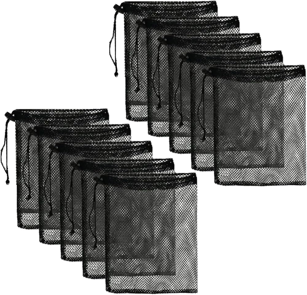PACKAGE INCLUDES: 10 PCS black durable nylon mesh drawstring bag. External Size: approx. 8 x 12 inches. Use for variety of small and medium-sized items at home