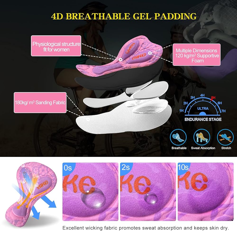 【ماصة للرطوبة وصديقة للبشرة】ملابس ركوب مبطنة رباعية الأبعاد للنساء مصممة من البوليستر بنسبة 100% ودرزات مسطحة رائعة، والتي تمتص الرطوبة وتطلق العرق من الجلد وتبقيك جافًا وباردًا دون التسبب في تهيج بشرتك.