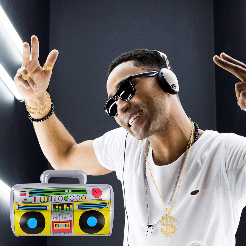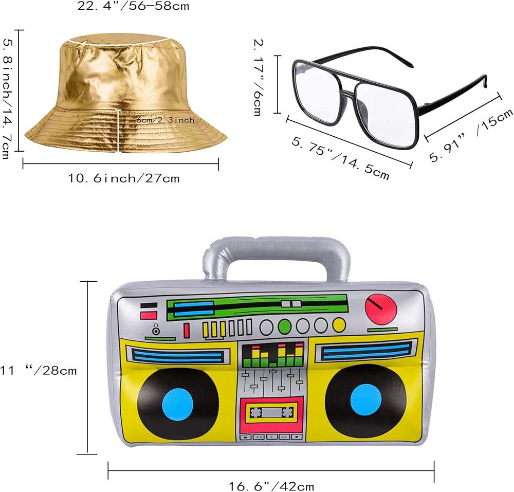 ★【زي الهيب هوب الكامل】- تتضمن مجموعة زي الهيب هوب قطعة واحدة من قبعات صياد الدلو المعدني، ونظارة واحدة من مغني الراب، وسلسلة ذهبية صناعية، و1 قطعة من الذهب الصناعي، و1 قطعة سوار من الذهب الصناعي، و1 قطعة من صندوق بوم قابل للنفخ، وزوج من أقراط الهيب هوب. نمط الهيب هوب الكلاسيكي الخاص بنا هو الخيار الأفضل لحفل الهيب هوب.