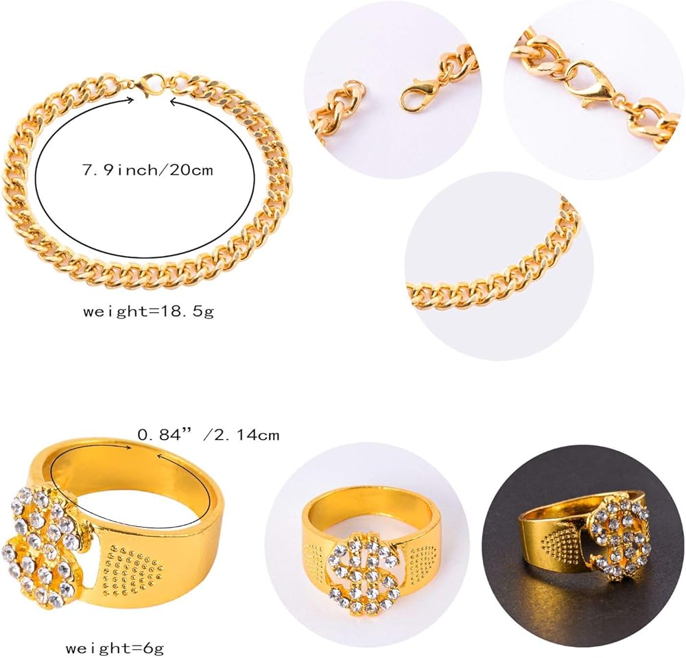 ★【قلادة صناعية/ سوار / خاتم】- القلادة والحلقة والسوار مصنوعة من الفولاذ المقاوم للصدأ، وهو متين. بالإضافة إلى ذلك، فإن الألوان الذهبية والزاهية تجعلها مناسبة تمامًا لملابس الهيب هوب الخاصة بك، بحيث يمكنك التميز بين الحشد وإظهار التألق.