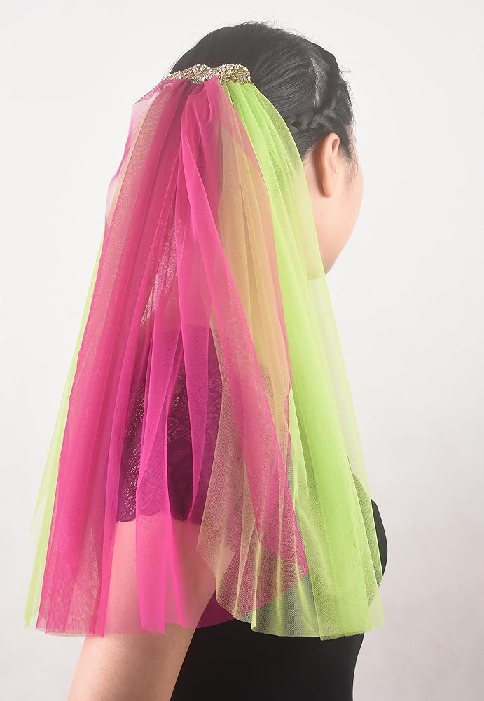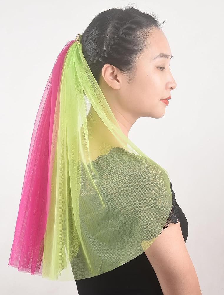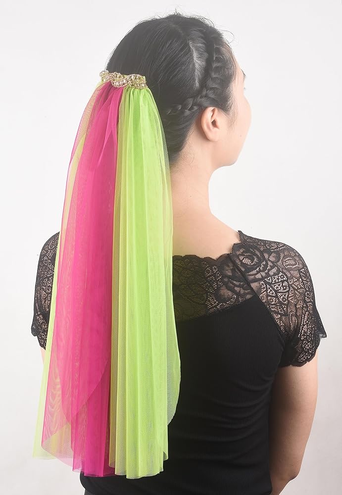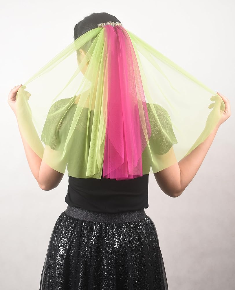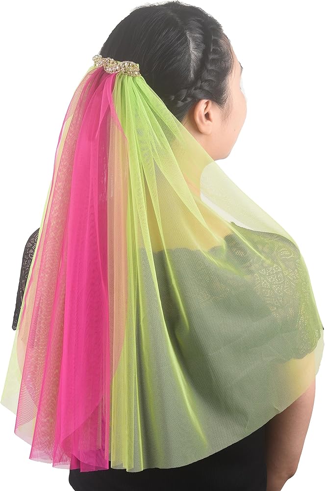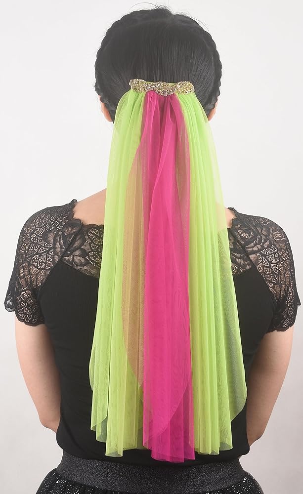 المقاس: الوشاح مصنوع من حجر الراين الذهبي ومادة التول مقاس 10.16 سم. يتكون من ثلاثة حجاب مقاس 20 بوصة بلونين مختلفين.