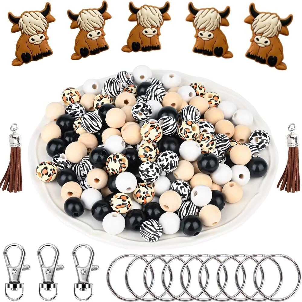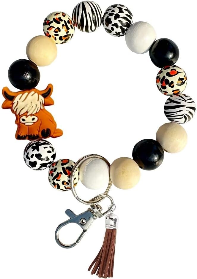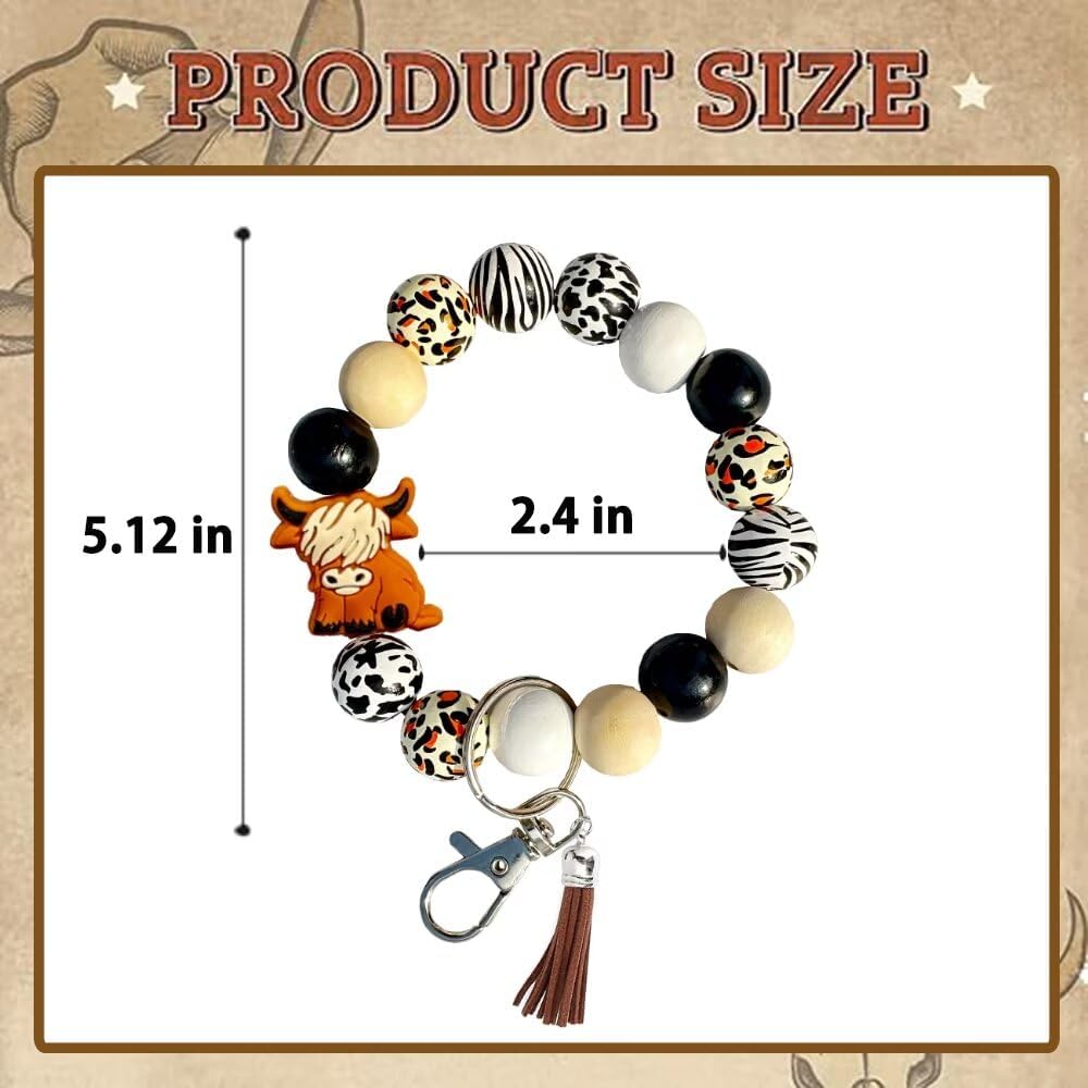 Cow Print Wooden Beaded Bracelet Keychain Wristlet Western Highland Key Ring Bangle Chains for Women with Leather Tasse