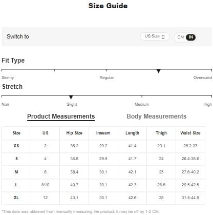 Large: US: 8/10", Hip Size: 40.7", Inseam: 30.1", Length: 42.3", Thigh: 26.5", Waist Size: 29.5-42.5"