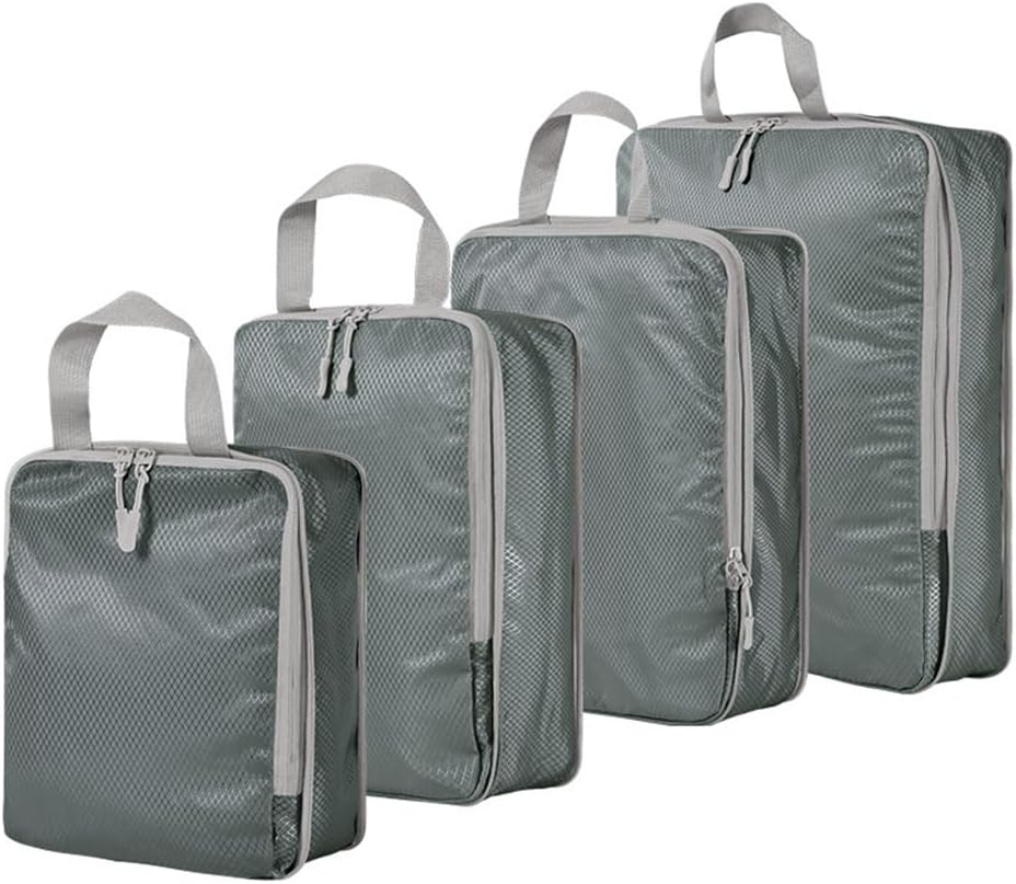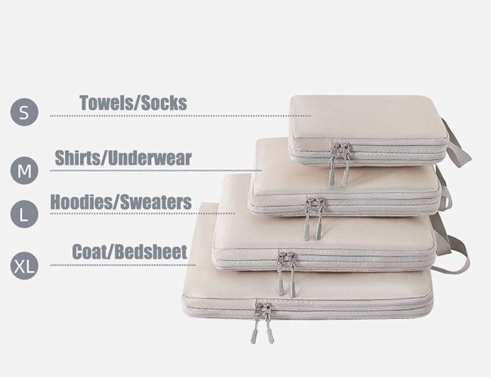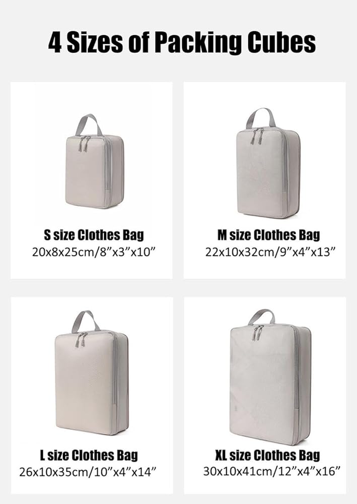 • 4 Different Sizes: The set includes an S size packing cube (20x8x25cm/8x3x10in), an M size packing cube (22x10x32cm/9x4x13in), an L size packing cube (26x10x35cm/10x4x14in), and an XL size packing cube (30x10x41cm/12x4x16in) for different sizes of travel clothes you might carry in your trip, such as towels, socks, underwear, shirts, hoodies, jackets, sweaters. coat, pants, even bedsheets