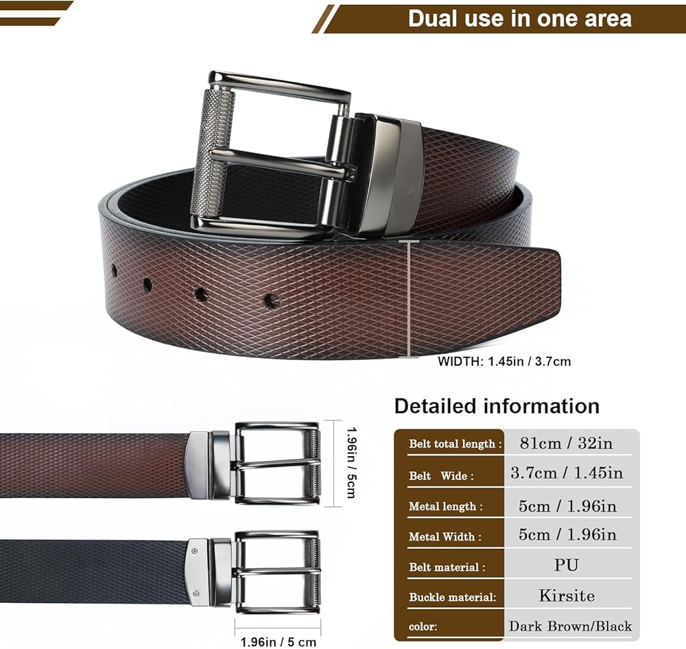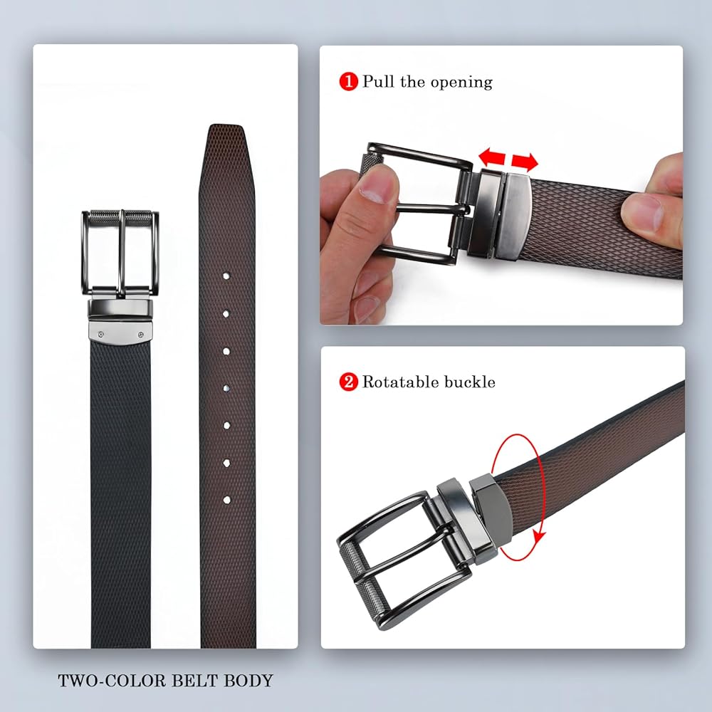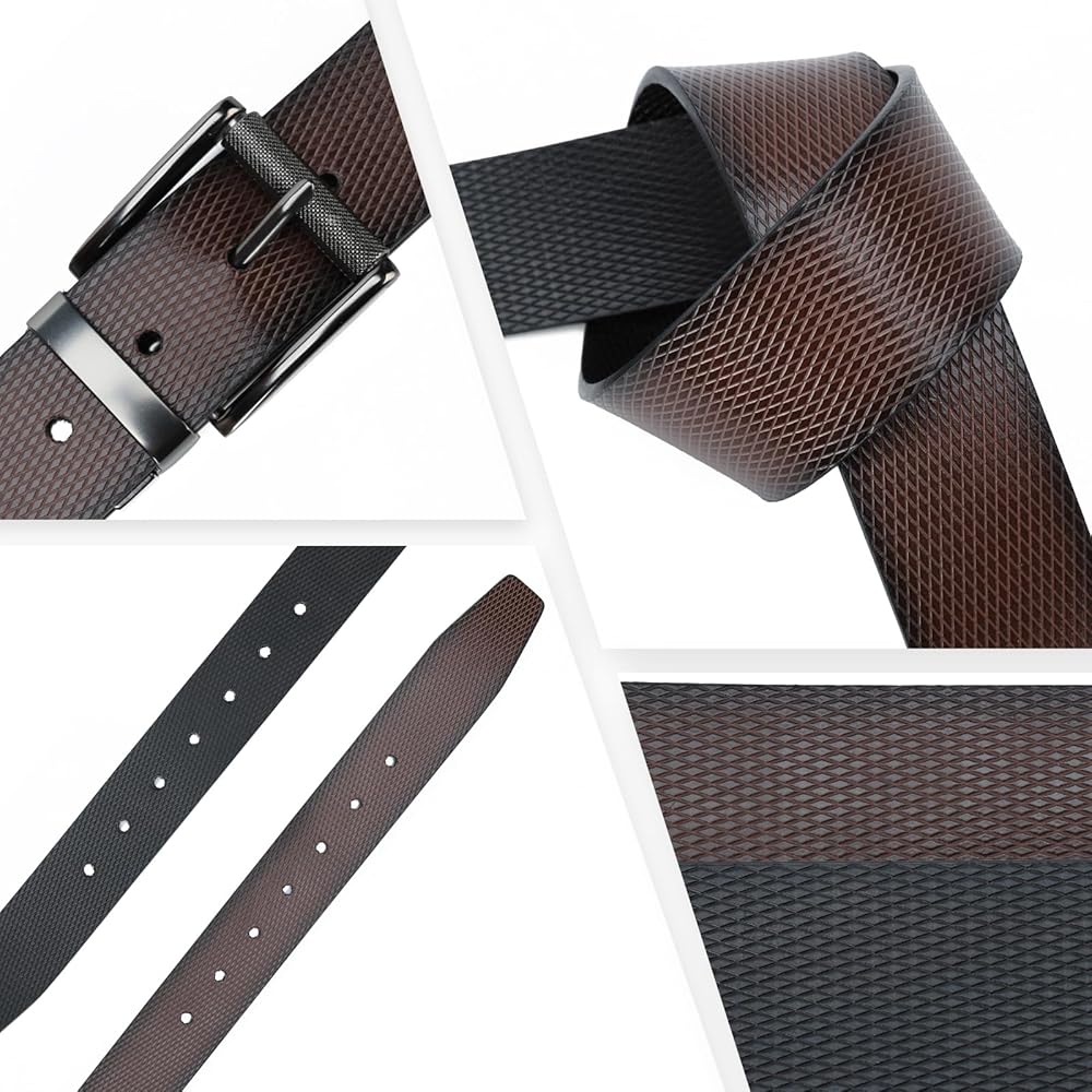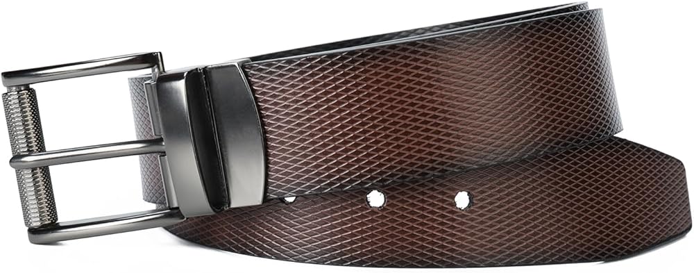 تطور 2 في 1: ارفع خزانة ملابسك مع السحر متعدد الاستخدامات لحزامنا الجلدي ذو الوجهين باللونين البني والأسود. استمتع بلونين في لون واحد، مما يجعله الرفيق المثالي لجينزك المفضل أو الملابس الكاجوال أو السراويل الرسمية. يمكنك التنقل بسهولة بين الإطلالات مع هذا الملحق الذكي.