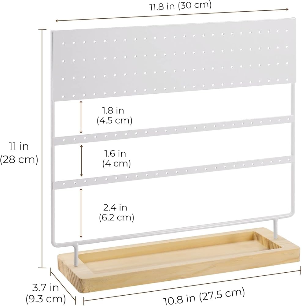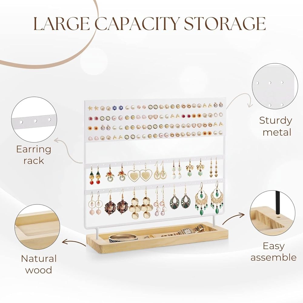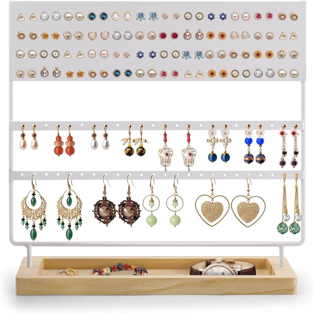 1x Earring Holder Organizer, Earring Hanger Rack Display Stand, Metal Jewelry Tower, Dangle and Hoop Earring Stand, 144 Holes with Wooden Base Tray for Jewelries and Accessories, White