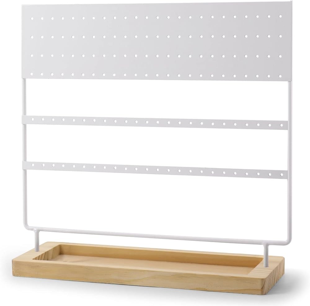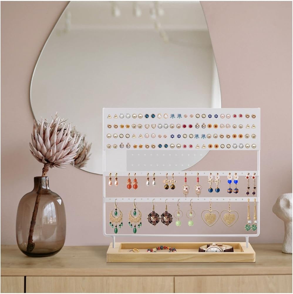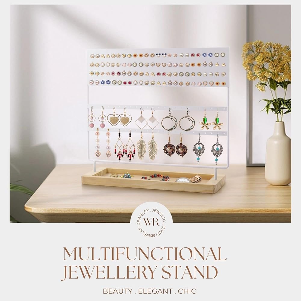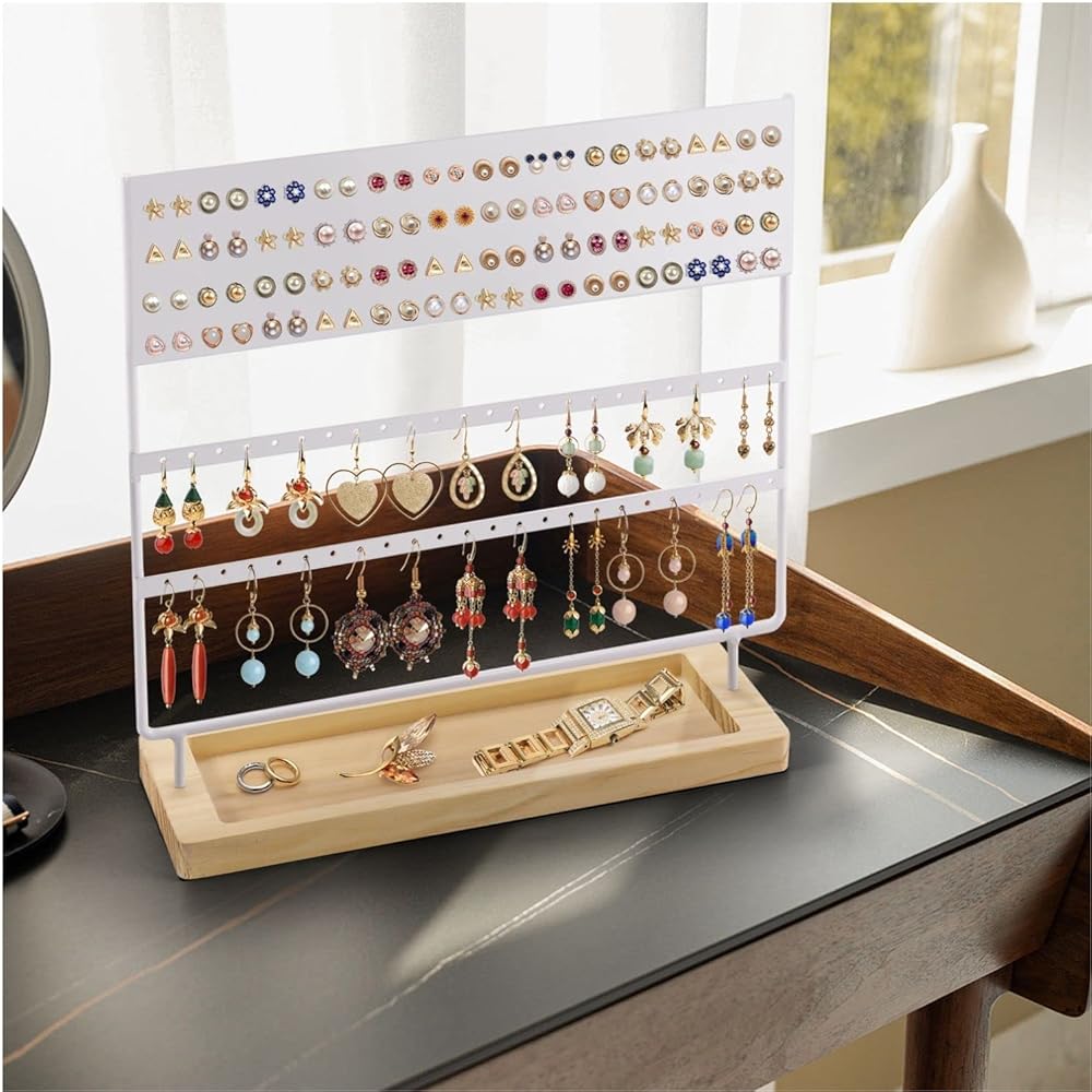 1x Earring Holder Organizer, Earring Hanger Rack Display Stand, Metal Jewelry Tower, Dangle and Hoop Earring Stand, 144 Holes with Wooden Base Tray for Jewelries and Accessories, White