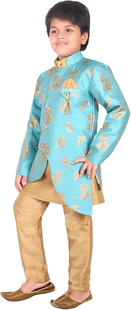 تفاصيل القماش: حرير من مزيج القطن ||عبوة المبيعات: 1 كورتا شيرواني، 1 بيجامة|| الفئة العمرية : من سنتين إلى 11 سنة || يأتي هذا المنتج مع بروش.