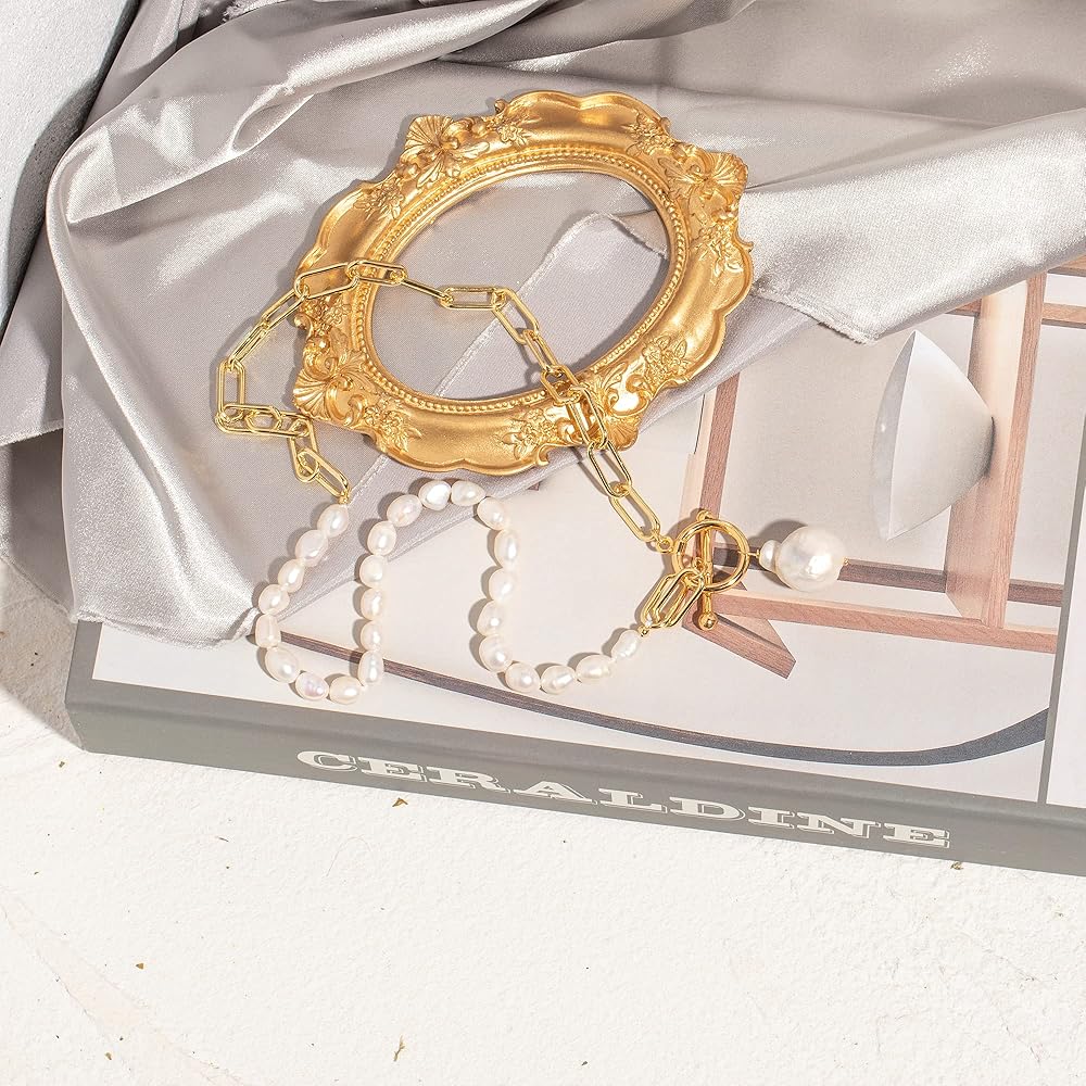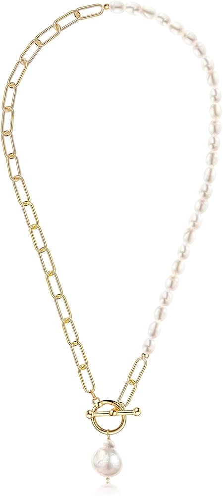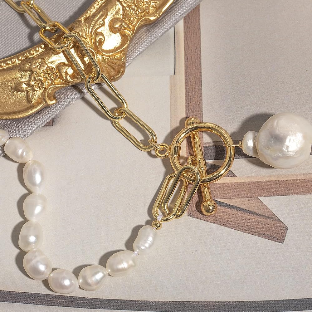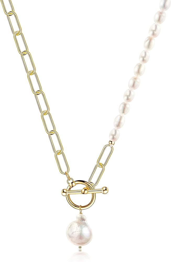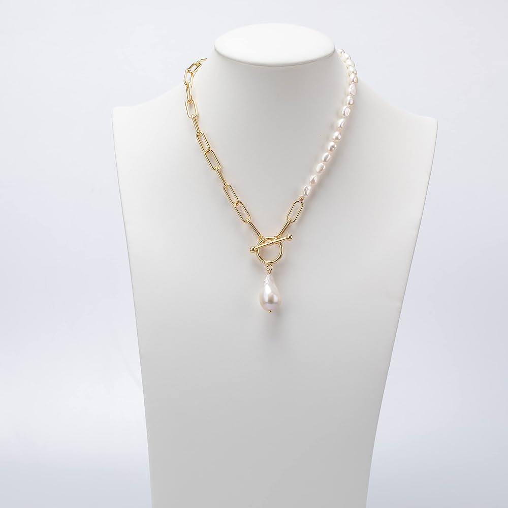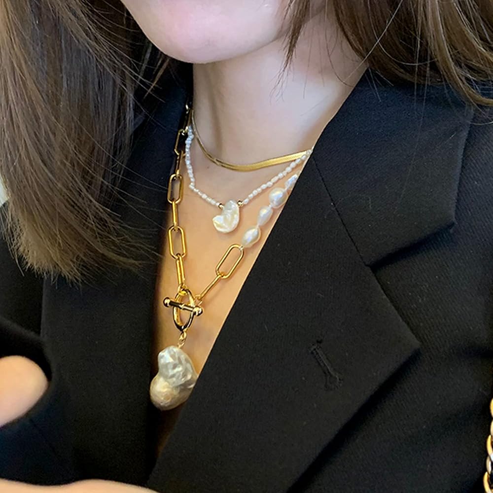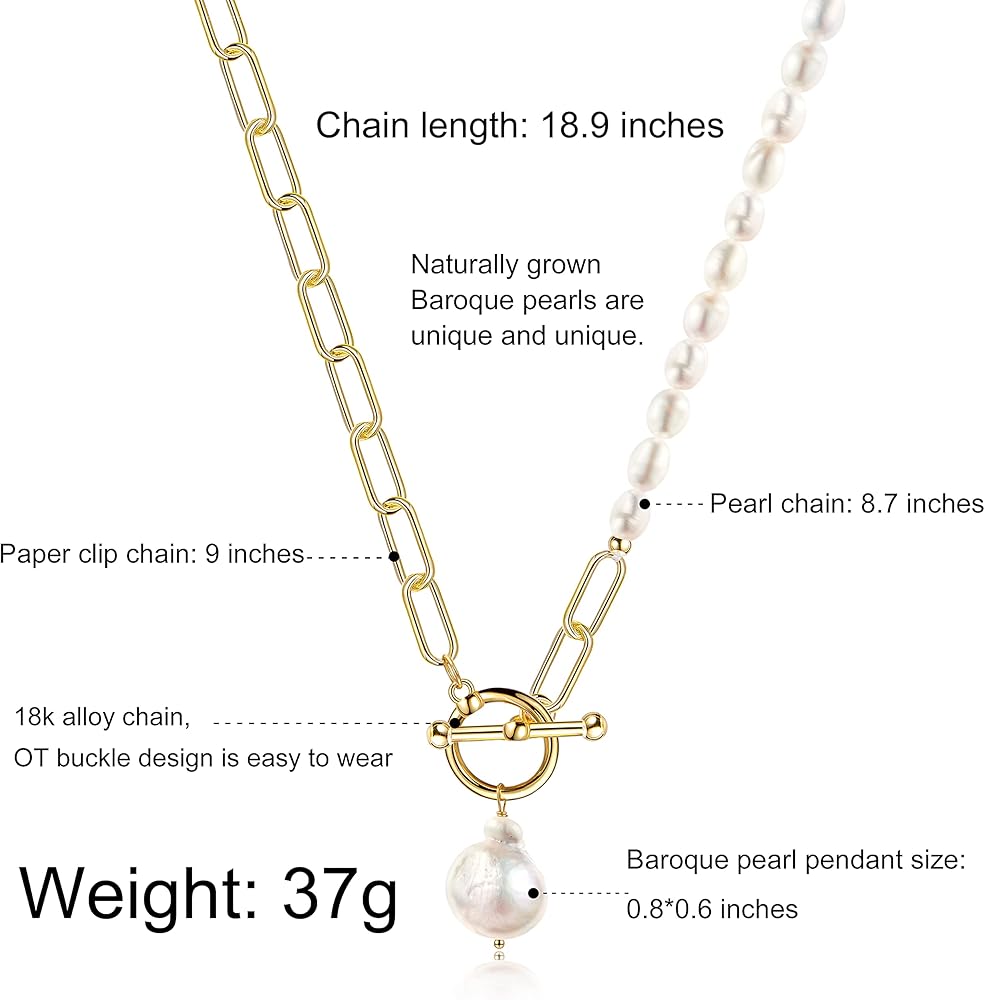 ❤مادة حرفية رائعة —— القلادة مصنوعة من لآلئ باروكية منتقاة بعناية. نحاس سلسلة مشبك الورق مطلي بخليط معدني عيار 18 قيراط، وهو مصنوع يدويًا بخيوط قطنية. سلسلة قلادة البانك أكثر سمكًا وليس من السهل كسرها. مع مقاومة الصدأ والتآكل وسطح ذهبي مضاد للخدش، فهي آمنة للارتداء.
