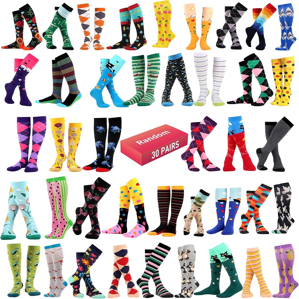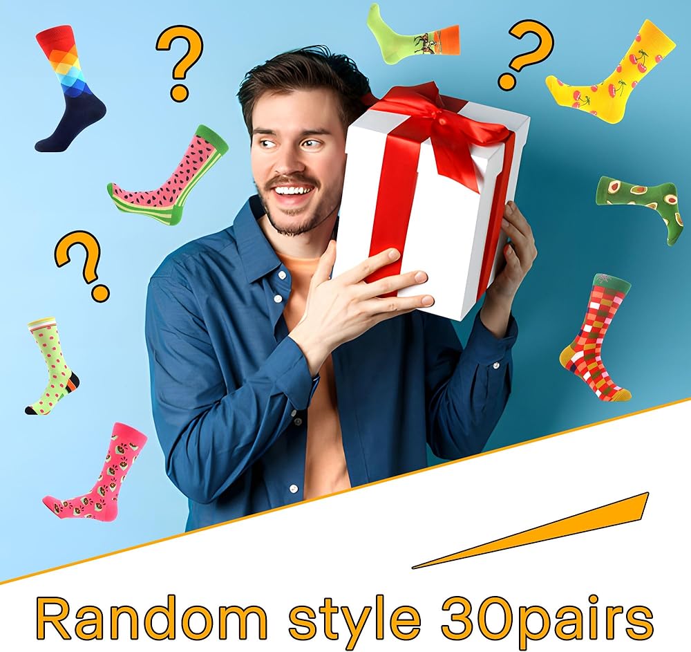 30 زوجًا من الجوارب: جواربنا العشوائية مناسبة للنساء من جميع الأعمار. بما في ذلك أنماط مختلفة من الجوارب، مثل الأشكال الهندسية، والمنقط، والمخطط، والمنقوش، وكتلة الألوان، والفواكه، والحيوانات، والجولف، والطعام وما إلى ذلك. فكرة رائعة لتزيين المنزل أو التبرع أو هدية مشاركة الشركة.