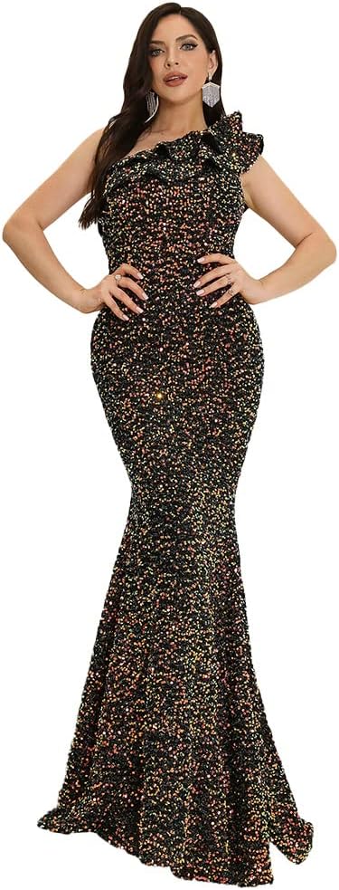 • التصميم: يتميز هذا الفستان الرسمي الرائع بكتف واحد مزخرف بكشكشة، وبدون أكمام، وبدون ظهر، وترتر ساطع، وطول يصل إلى الأرض، وحاشية حورية البحر. التصميم المثالي النحيف يجعلك بطل الرواية اليوم.