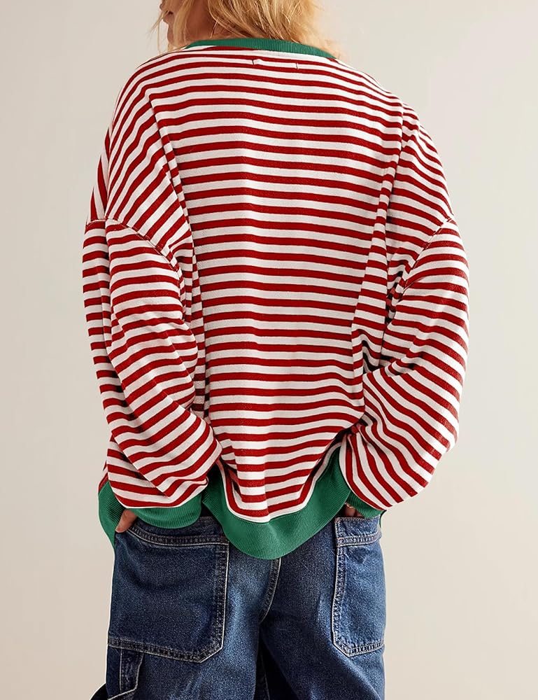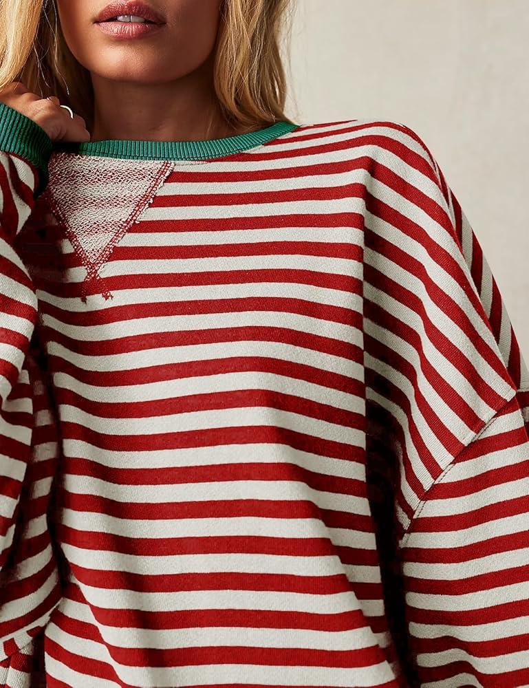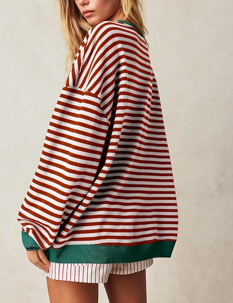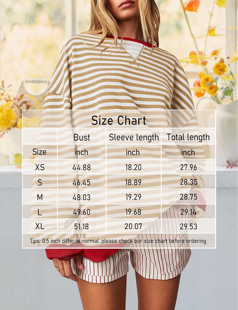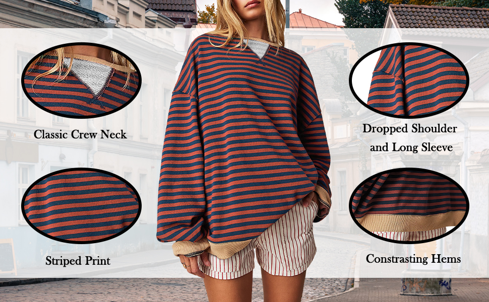 السمات: سويت شيرت للسيدات، سويت شيرت كبير الحجم للسيدات فضفاض، قمصان طويلة الأكمام للنساء تتميز بأكمام طويلة، رقبة دائرية، طباعة مخططة، أكتاف منسدلة وحواشٍ متباينة، قمصان نسائية طويلة الأكمام مريحة وكبيرة الحجم، مع مخطط أساسي و حواف متباينة لمظهر ذو أبعاد ستجعلك تبدو عصريًا وأنيقًا للغاية