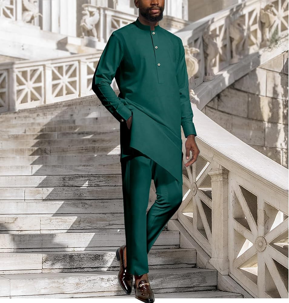 مقاس كلاسيكي ورفيع: مجموعة رجالية رسمية أفريقية تقليدية مكونة من قطعتين / رقبة هنلي / ياقة ماندرين / ملابس داشيكي بأكمام طويلة تجعلك تبدو بسيطًا ووسيمًا. تصميم البنطلون مناسب ولون ثابت وجيبين.