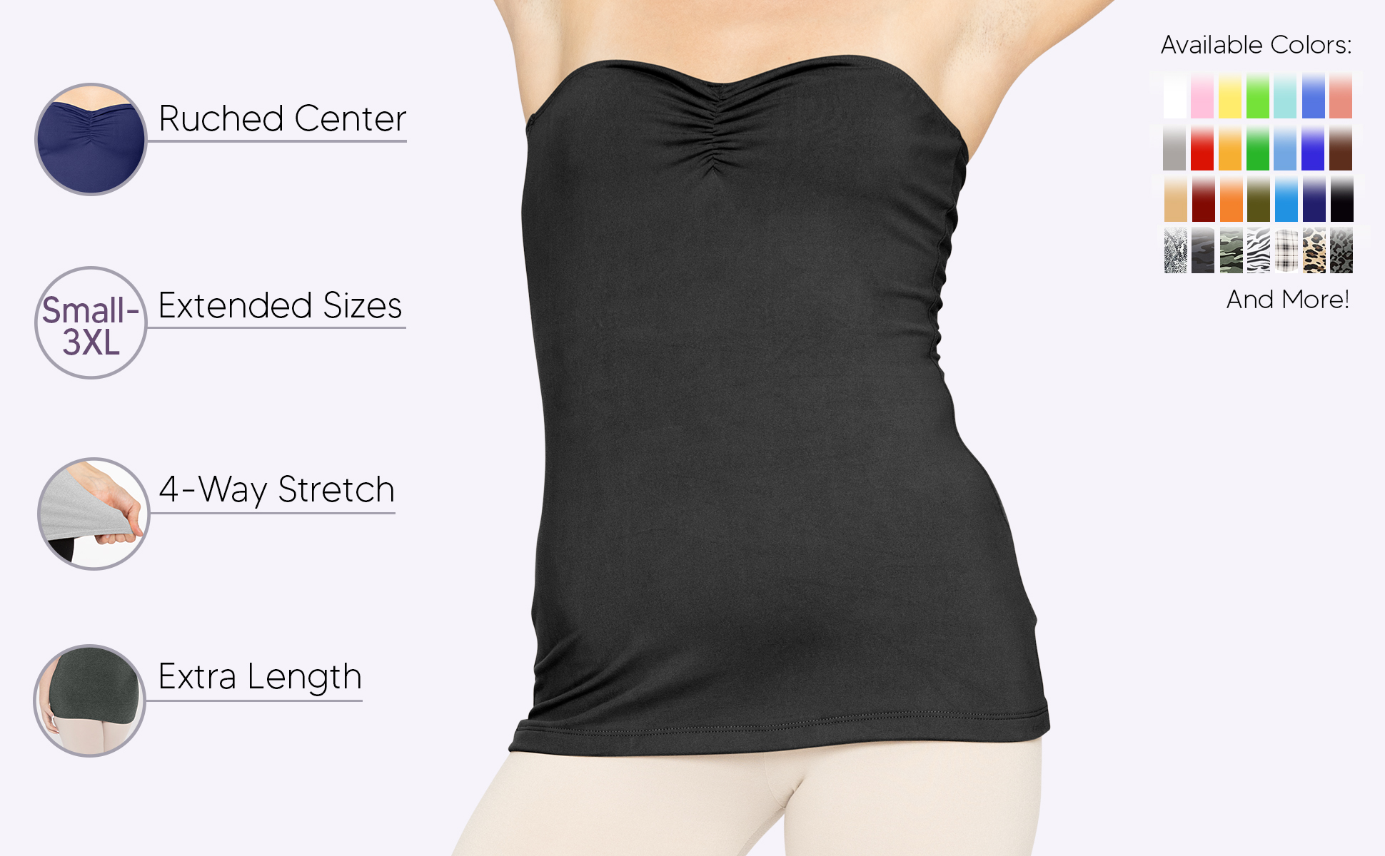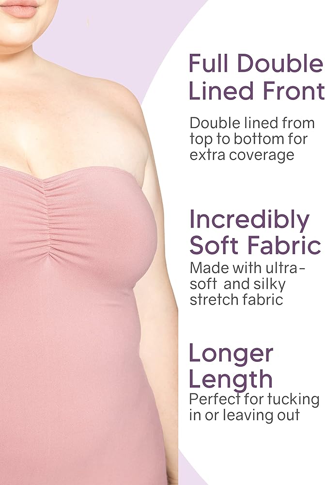 المميزات الرئيسية: متعة الارتداء، القميص بدون حمالات ذو بطانة مزدوجة من الأمام ويتميز بتفاصيل صدر مرنة لطيفة وأنيقة في المنتصف للحصول على خط عنق بسيط على شكل قلب. نسيج مطاطي ممتاز 95% بوليستر / 5% ألياف لدنة يتميز بتمدد في أربعة اتجاهات، وهو غير شفاف، ولكنه خفيف مثل الهواء للسماح بالحركة والسهولة. جرب لماذا يعتبر نسيج Oh So Soft الخاص بنا هو المفضل لدى العملاء. الجزء العلوي المرن بقياس نصف بوصة يجعل من السهل ارتداؤه وخلعه أثناء تثبيته في مكانه طوال اليوم. يمكن ارتداؤه كقميص للرضاعة.