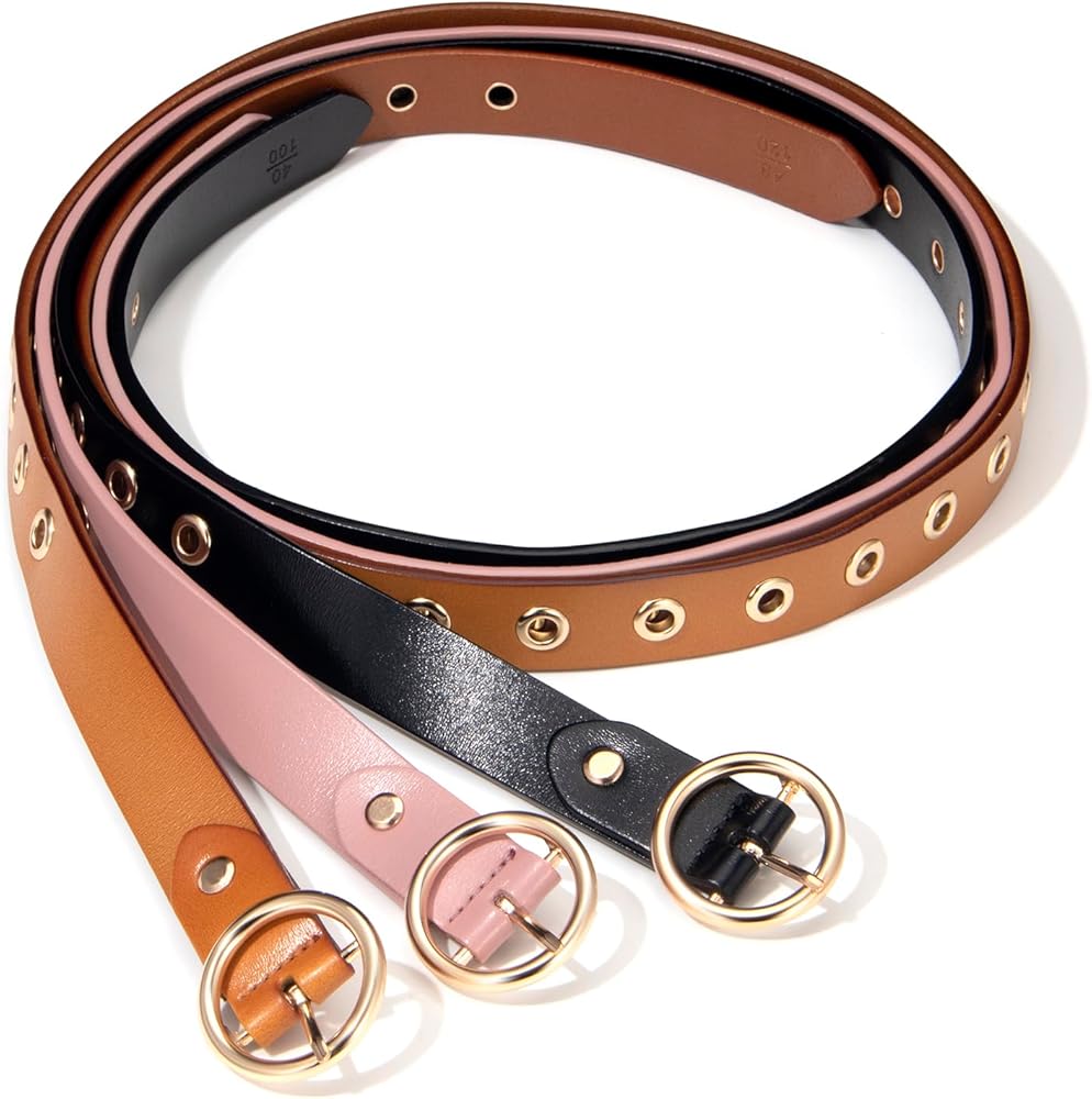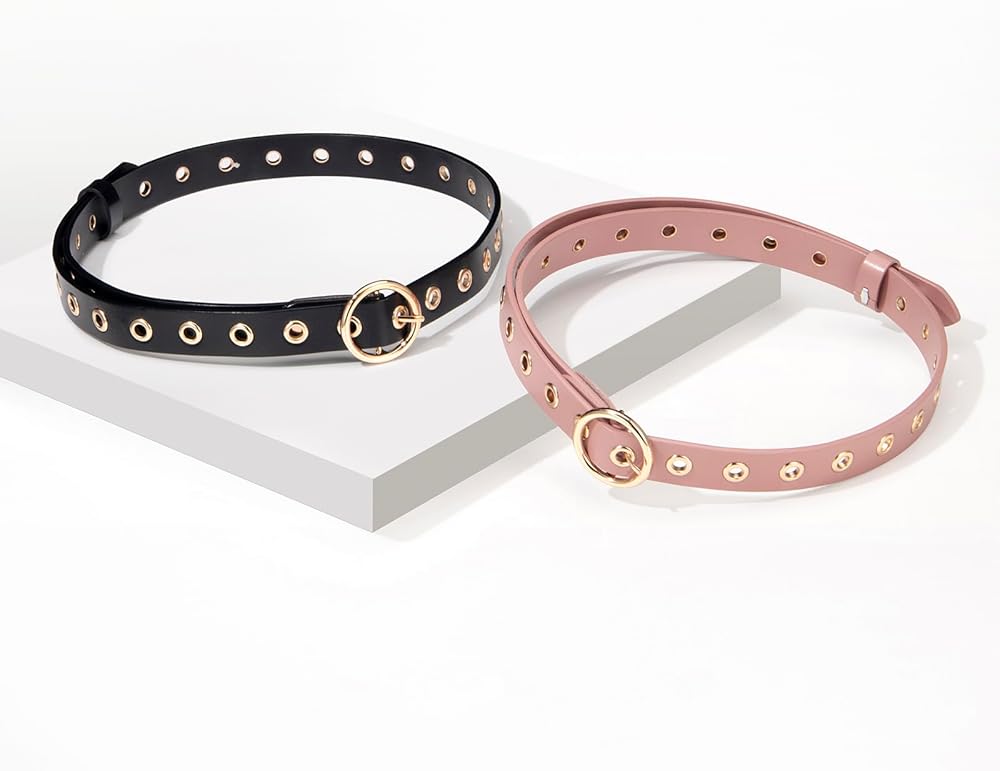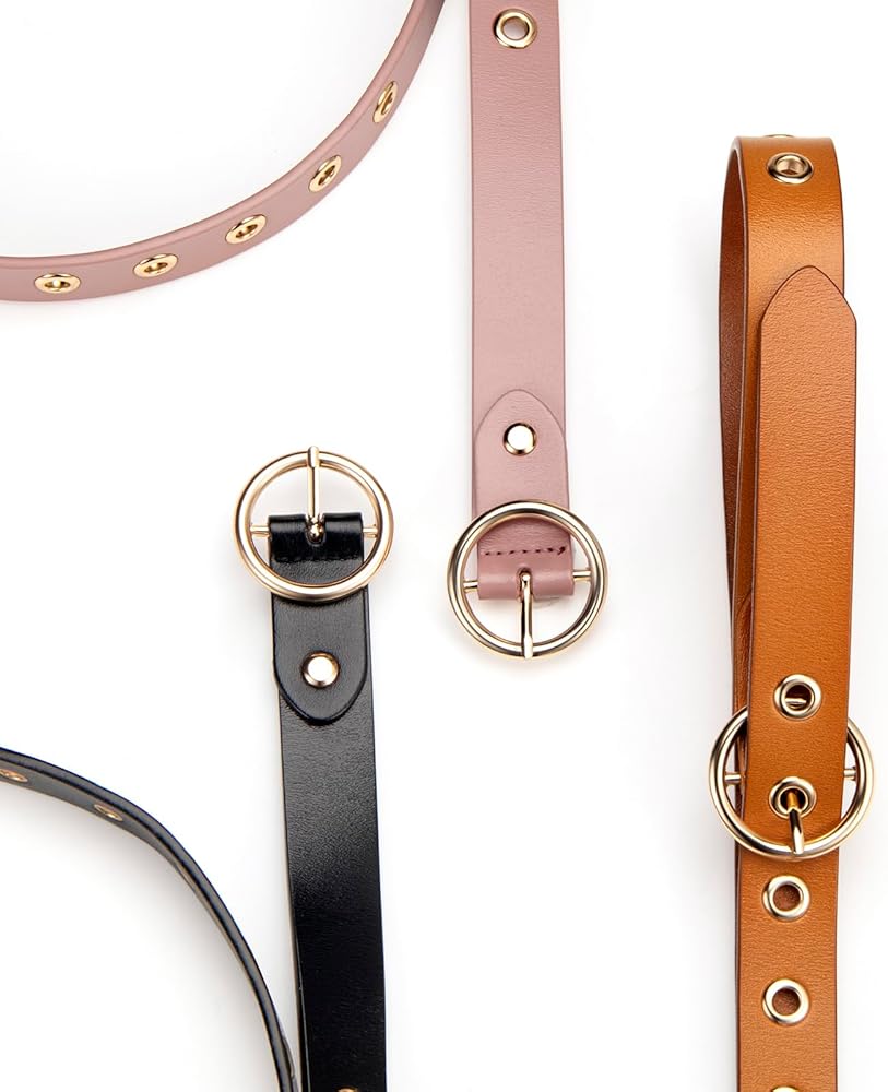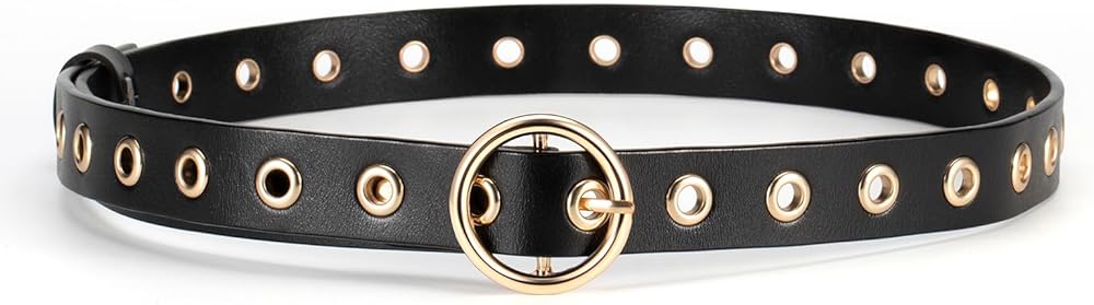 - حزام رفيع مصنوع من الجلد المحبب مع فتحات وإبزيم دائري من المعدن.