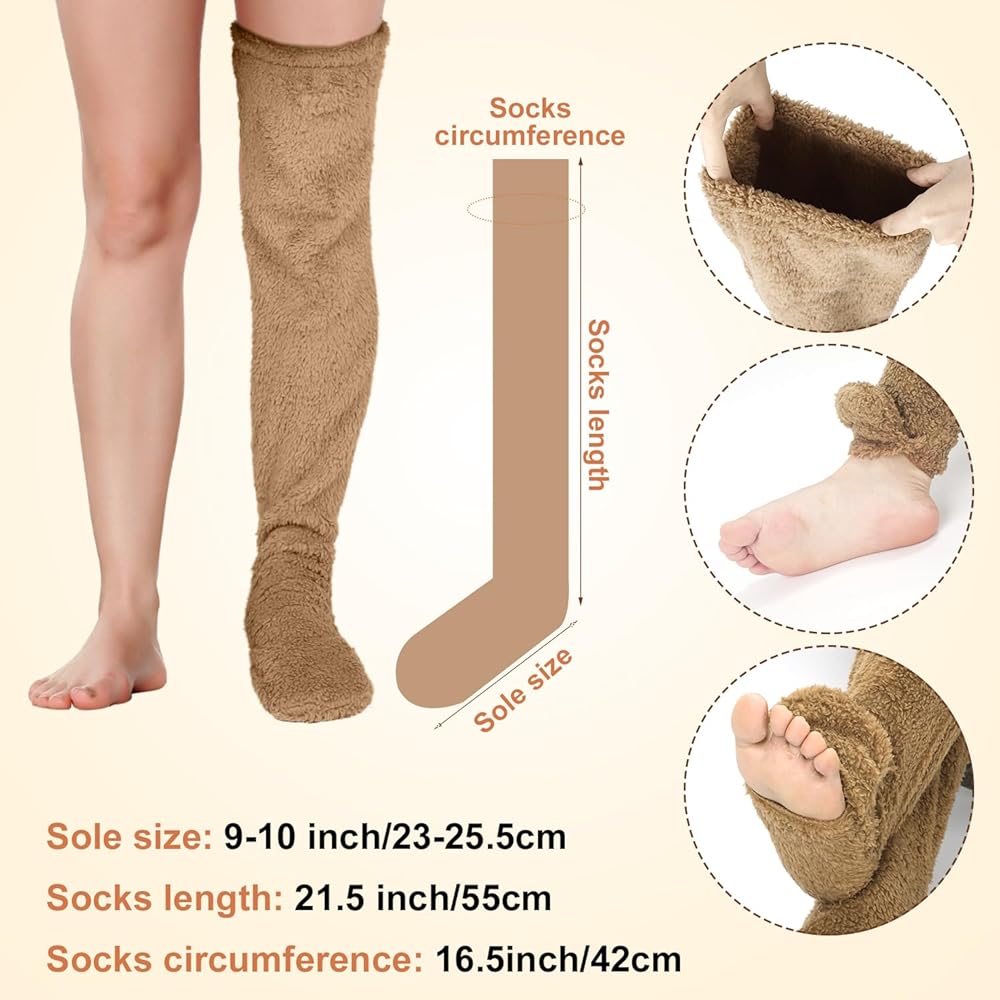 Warm material: knee high fuzzy socks are made of large polyester. The double-sided plush provides double warmth for your legs, making it very soft and comfortable to wear and can enjoy your legs a warm feeling.