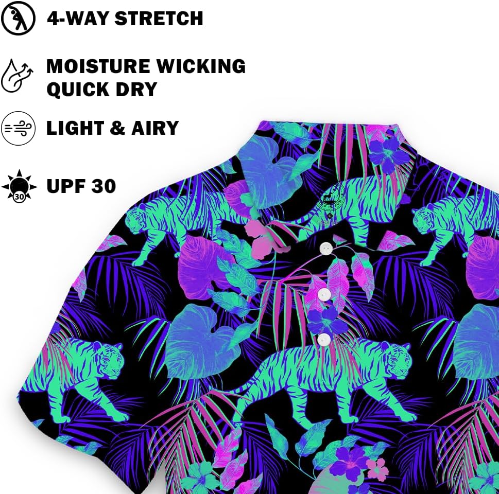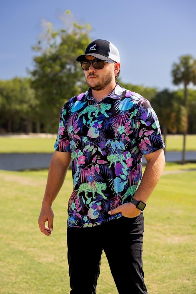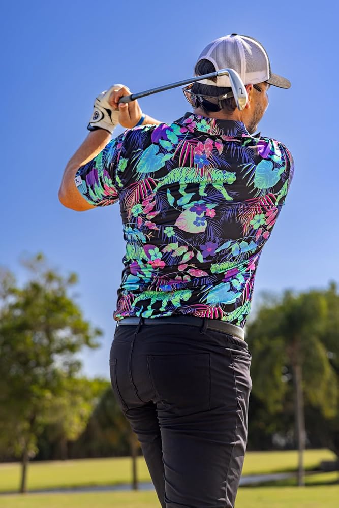 • قميص جولف NEON TIGER FUN: ماذا يعني لك الجولف؟ نحن نؤمن بأن كسر 90 هو فوز اليوم ونحن نصنع ملابس الجولف للرجال الذين يعتقدون ذلك أيضًا! تصميماتنا الجريئة، المتوافقة مع الراحة، توازي الطريقة التي نلعب بها اللعبة - أحيانًا غير تقليدية، ولكن ليس على محمل الجد أبدًا! قميص الجولف غير التقليدي هذا أنيق ومريح وسيلفت الأنظار بالتأكيد في المسار! في الحقيقة، لم نسمع عن شخص واحد ارتدى هذا القميص ولم ينال الثناء في الدورة!