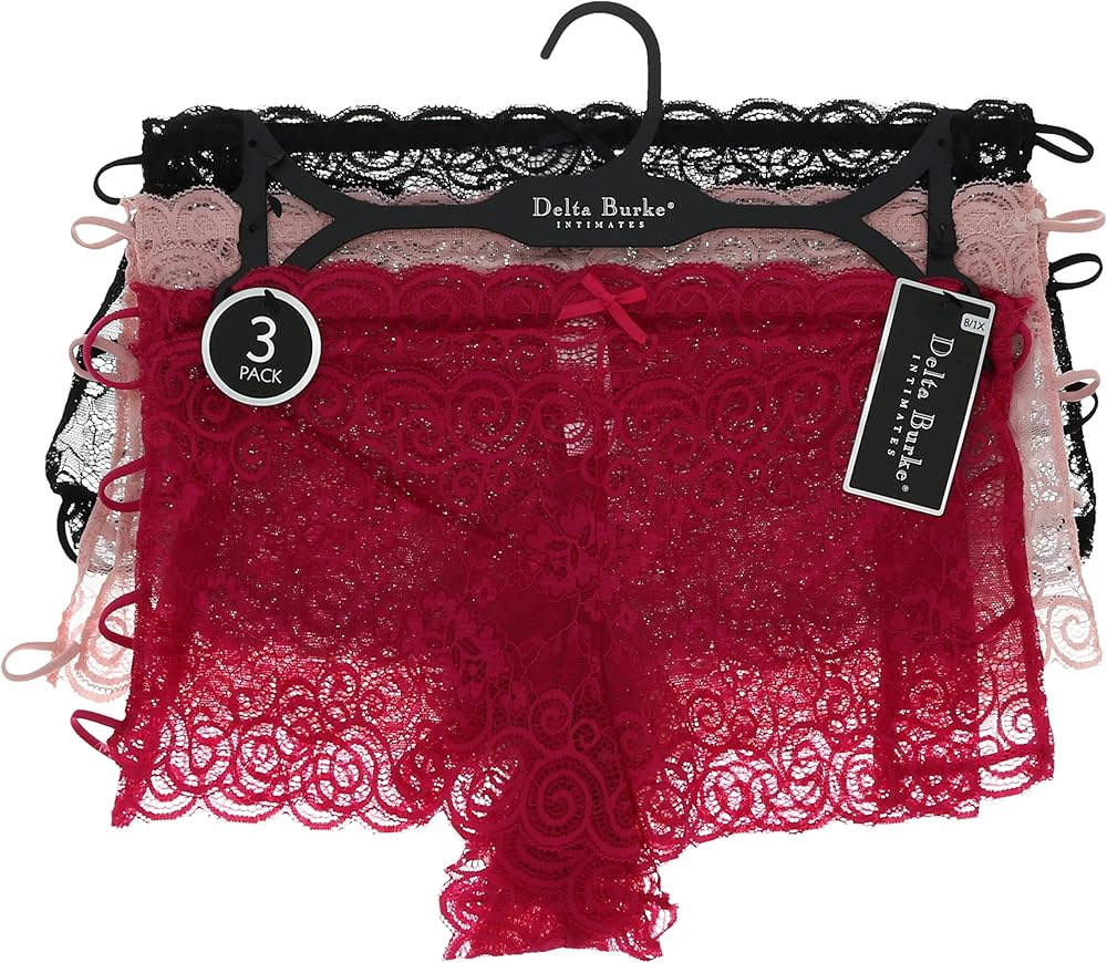 Delta Burke Intimates women's super sexy full lace boy shorts with cut-out, triple strap sides. These underwear are so sexy and fun. You will feel feminine and beautiful when you have these on. The crotch is reinforced for comfort and hygiene. This is a three pair value pack in fun, coordinating colors. Delta Burke Intimates is a US brand known for quality of fit, design and style.