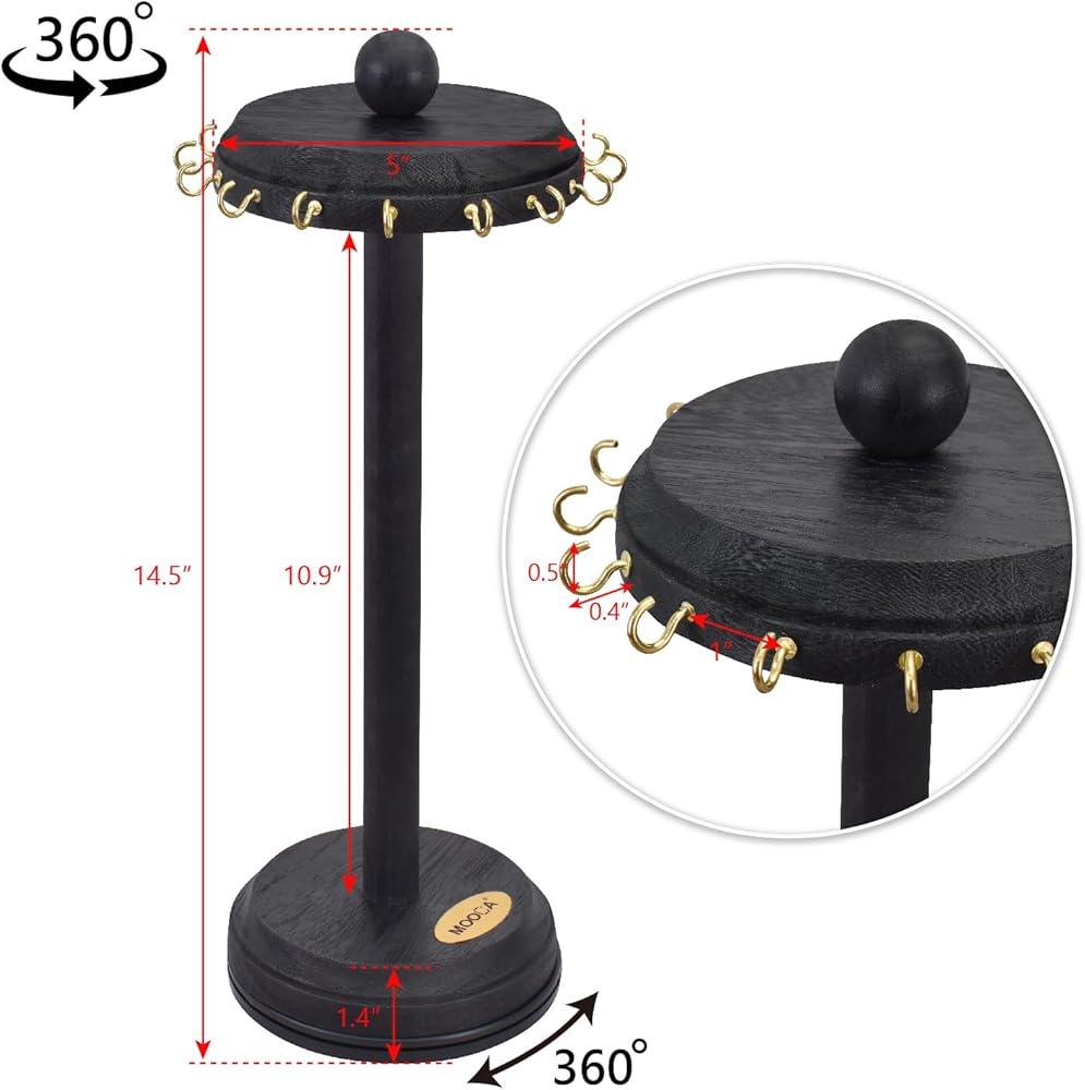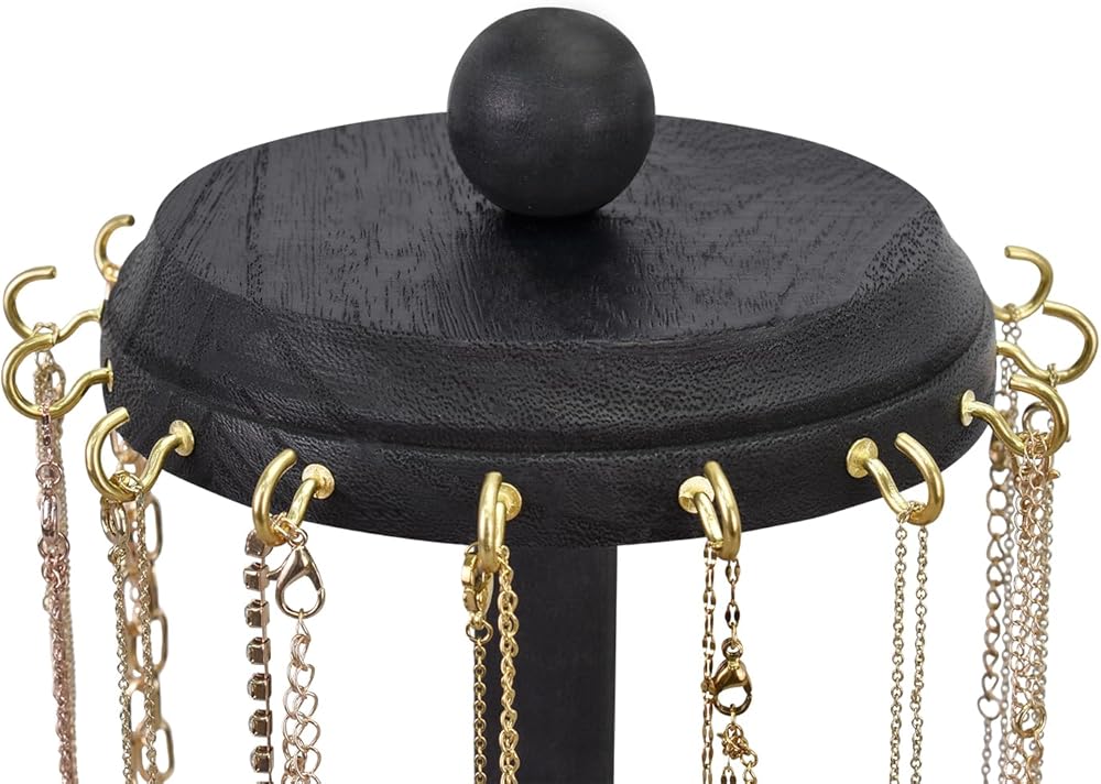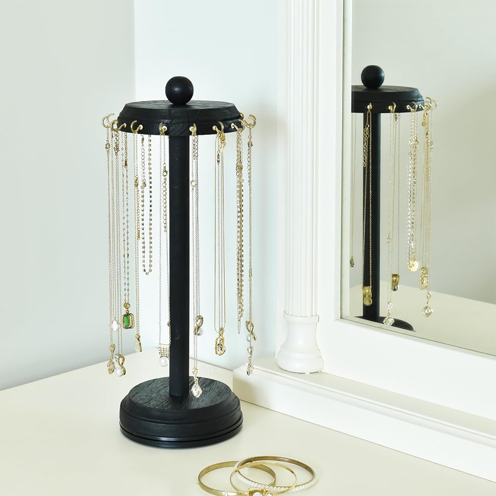 منظم عرض القلائد الدوار - مصمم بـ 16 خطافًا داخليًا يوفر مساحة واسعة لتعليق القلائد والأساور وأكثر من ذلك، مما يجعله طريقة مريحة وأنيقة لعرض مجوهراتك. تتيح ميزة الدوران سهولة الوصول إلى مجوهراتك، مما يجعل من السهل اختيار القطعة المثالية لملابسك.