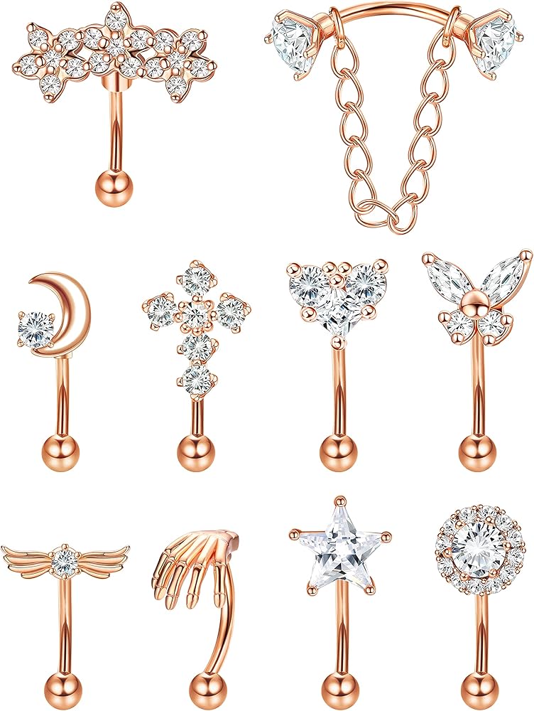 ما ستحصل عليه: يأتي مع 10 قطع من حلقات الحواجب التي تثقب الجسم بأنماط مختلفة، روك/دايث/ثقب الحواجب، بما في ذلك مجوهرات ثقب الزهرة، حلقة حواجب الفراشة، القلب/القمر/هالو/نجمة/صليب/سلسلة/أقراط غضروف تشيكوسلوفاكيا لليد.