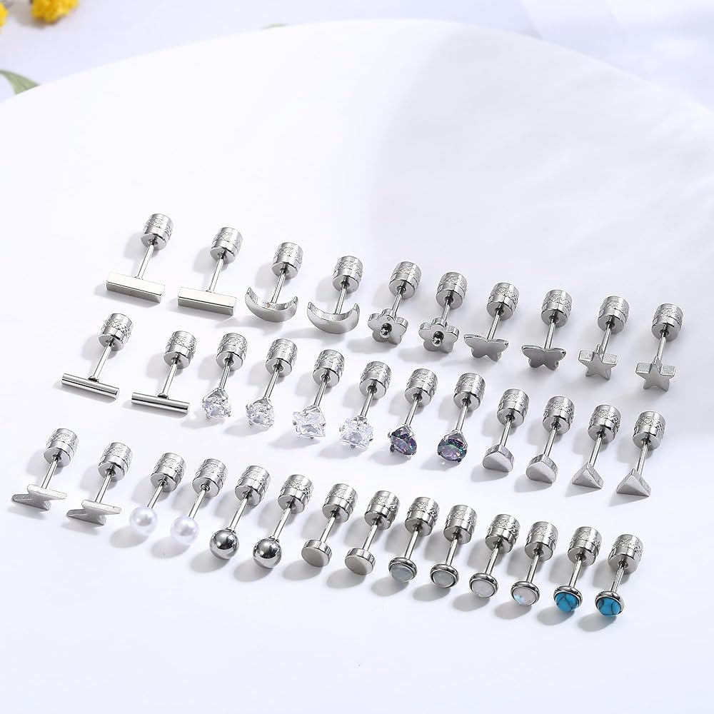 FASACCO 18 زوجًا من الأقراط اللولبية الخلفية المصنوعة من الفولاذ المقاوم للصدأ للنساء والرجال أقراط صغيرة مسطحة الظهر أقراط زركونيا مكعبة لا تسبب الحساسية للأذنين الحساسة