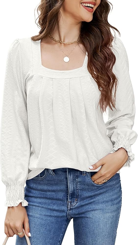 - المزايا: قمصان برقبة مربعة، تصميم مطوي، أكمام طويلة منتفخة مع أساور مدخنة، لون ثابت، هذه القمصان تجعلك ساحرة وأنيقة.