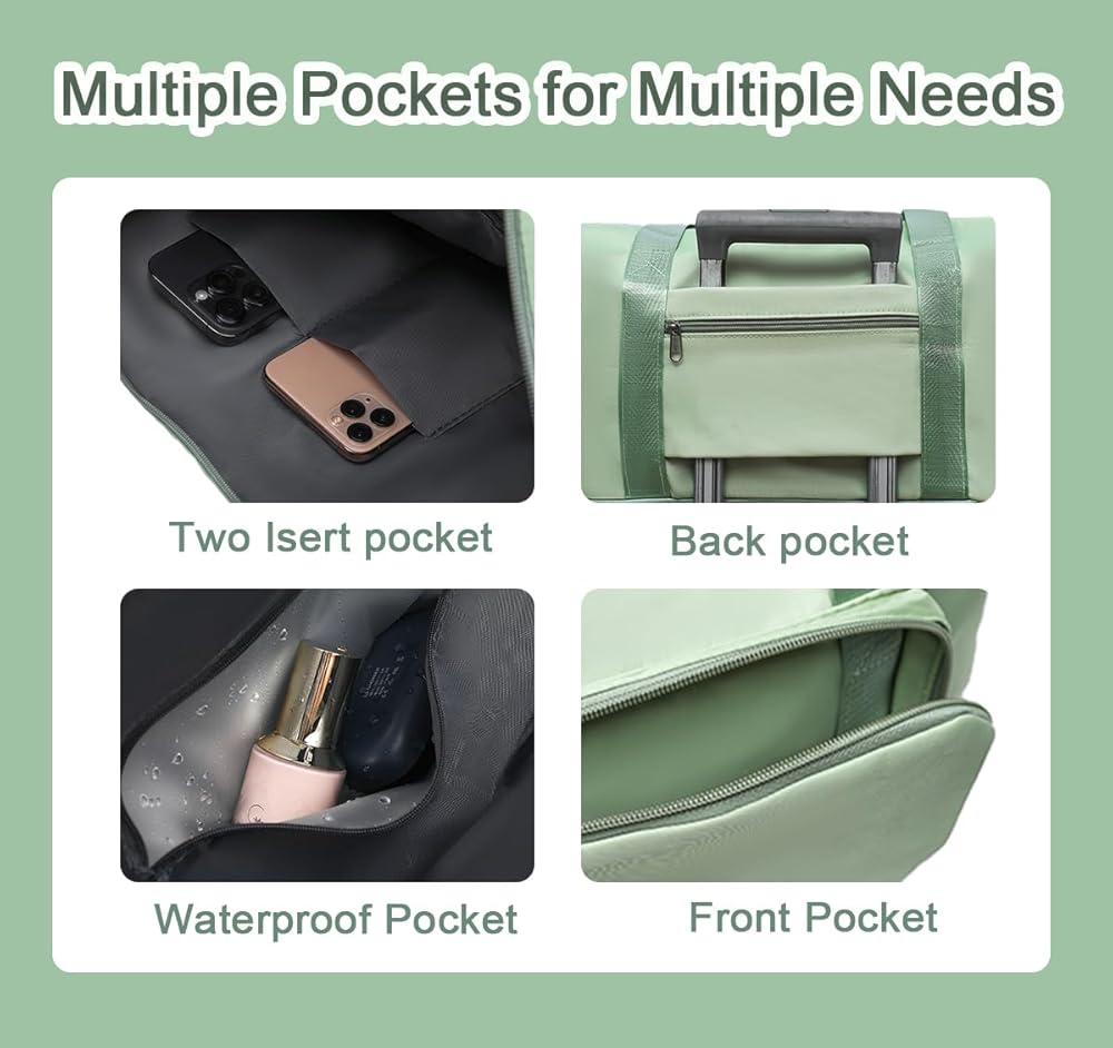 سعة كبيرة والمزيد من الجيوب✈ يمكن أن تناسب المساحة الواسعة بسهولة معظم احتياجاتك اليومية. تحتوي على جيبين وحقيبة مبللة صغيرة بسحاب. يمكن أن تساعدك على فصل العناصر الجافة والأشياء المبللة. جيب بسحاب في الخلف لتخزين مفاتيحك أو بطاقة الهوية أو جواز السفر.