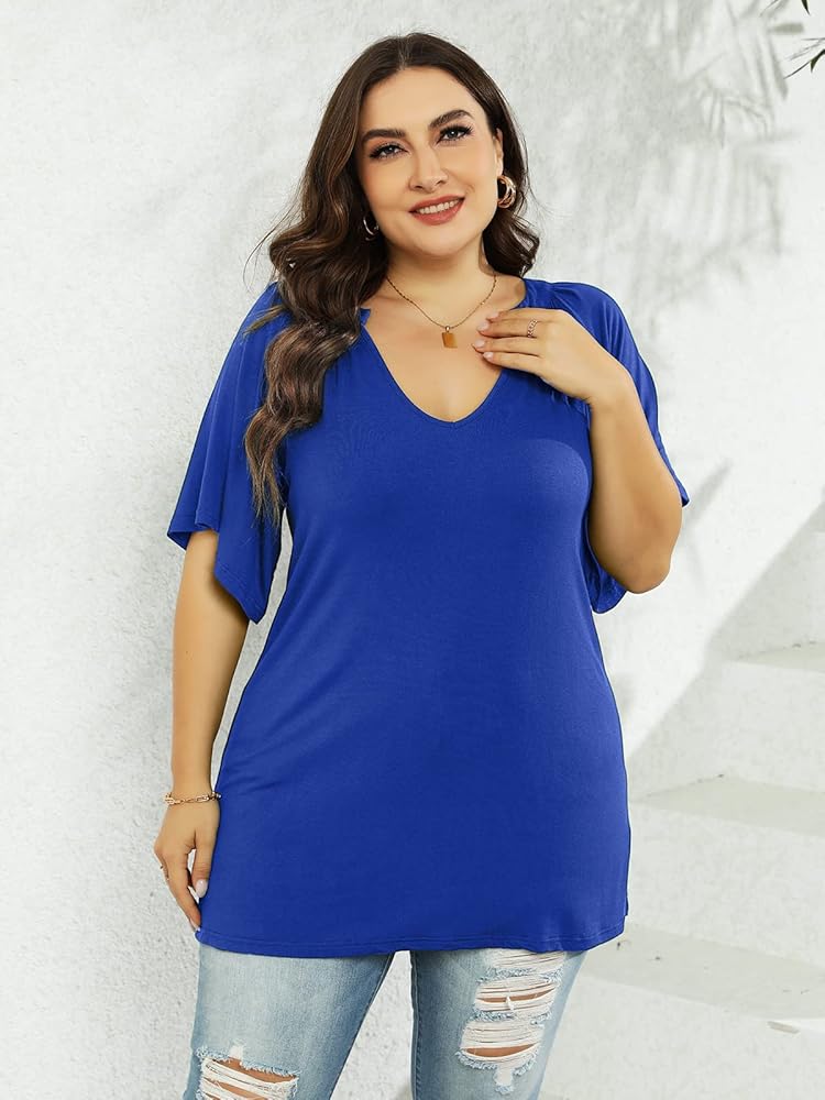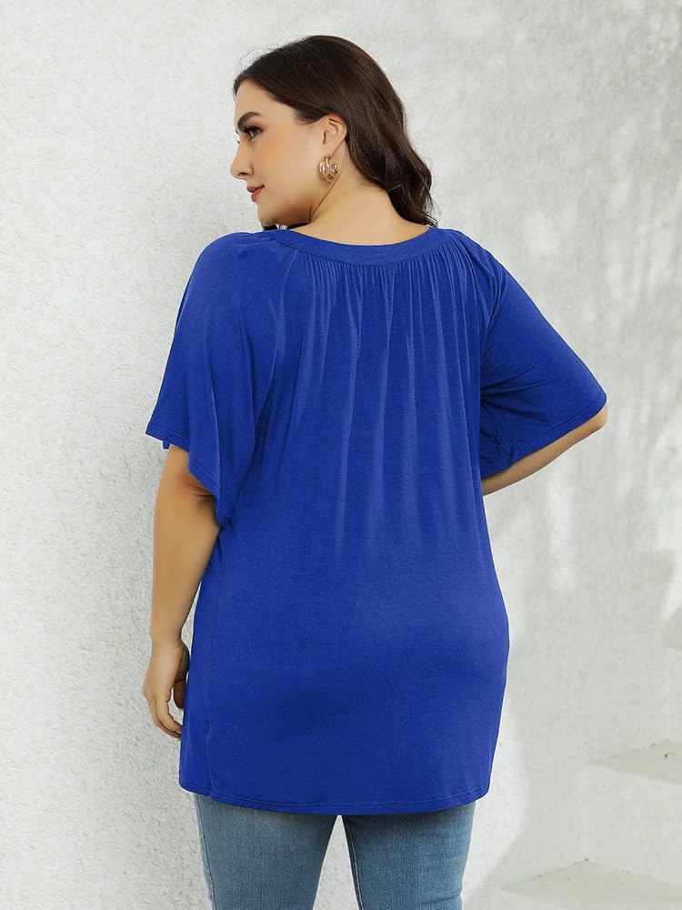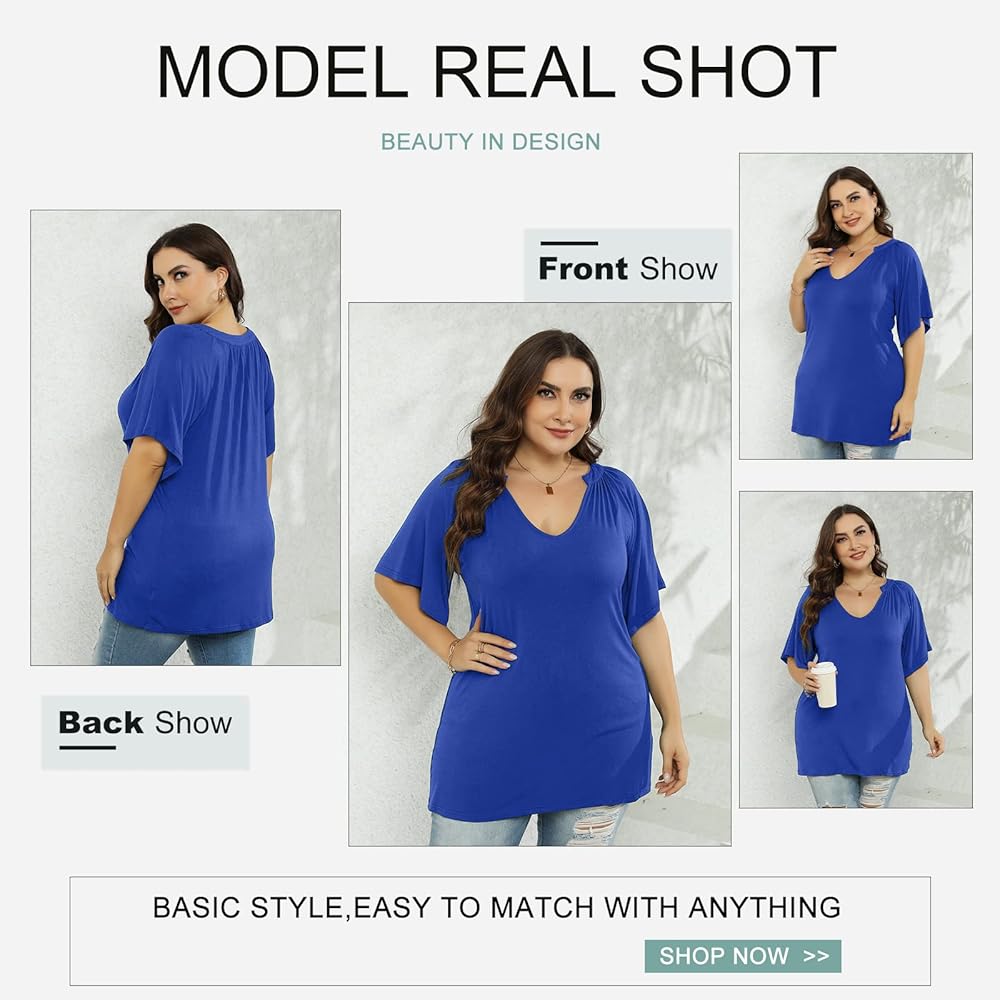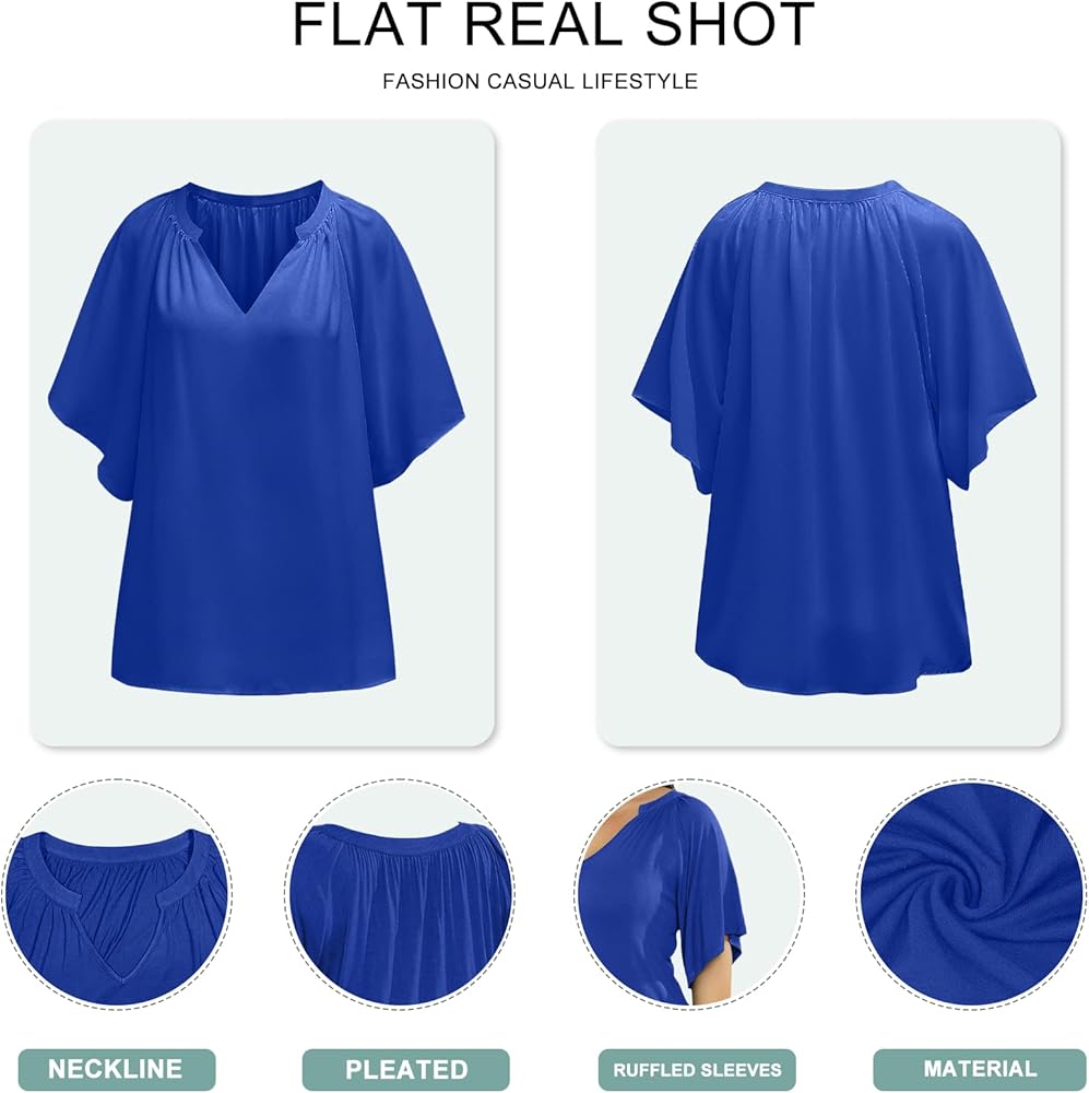 ميزات القمصان: قمصان تونيك عصرية بمقاس كبير هي أهم ما يميز قمصان الصيف، أنماط كاجوال وبسيطة، رقبة على شكل حرف V مثيرة، أكمام مكشكشة، أكمام قصيرة، تي شيرت مطوي متدفق، يجعلك تبدو رائعًا وأنيقًا