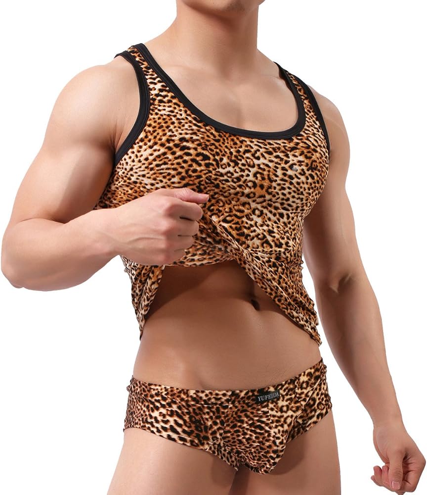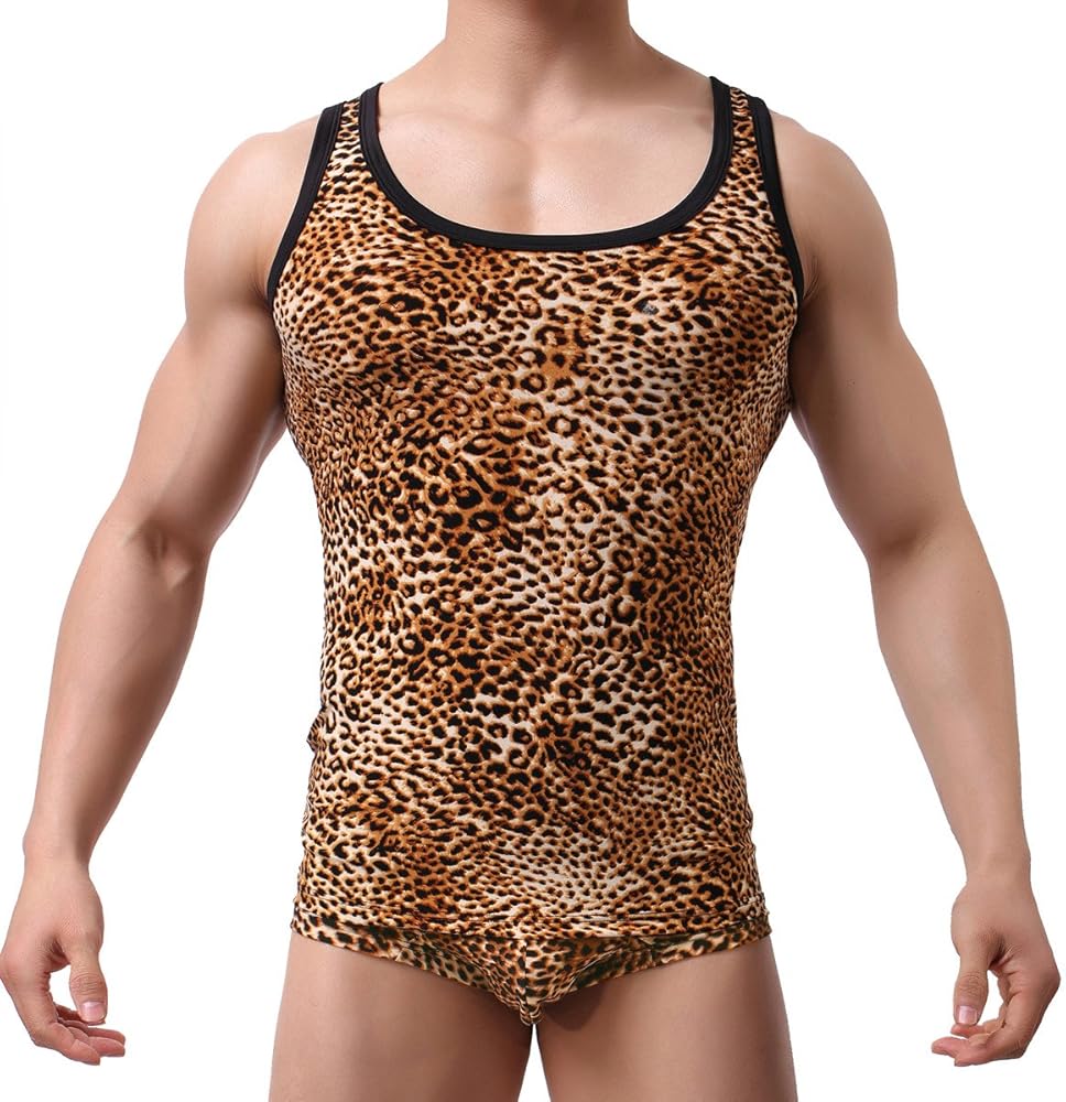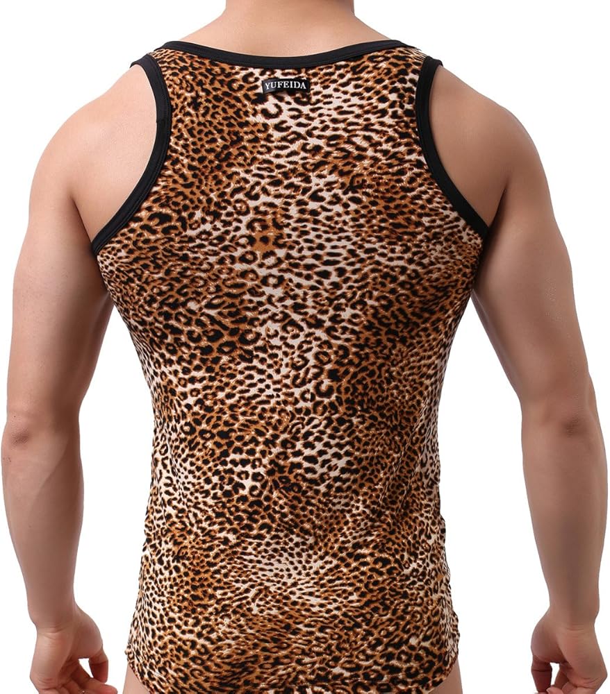 Sexy and fashionable leopard look tank tops for men, soft and comfortable touch for all day wearing, available for many occasions: party, costums, club, home lounging, sleeping, sporting, etc. 1 x Tank Top included.