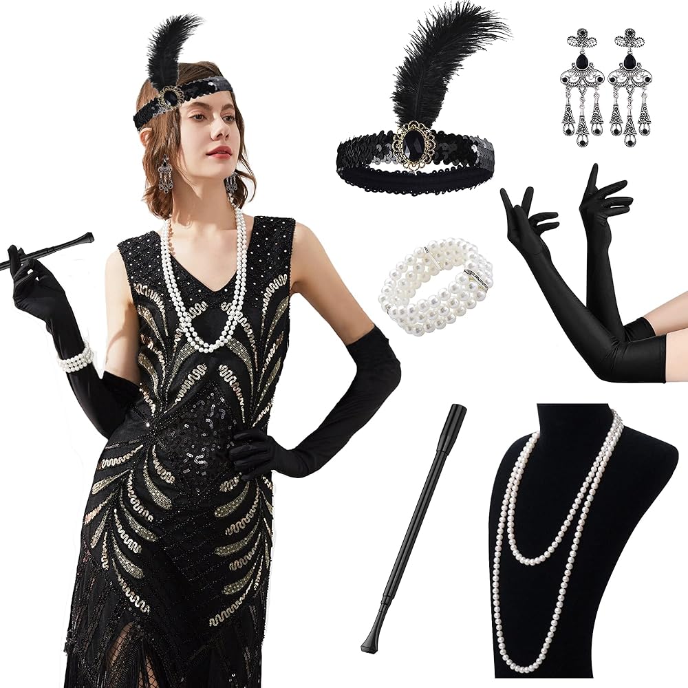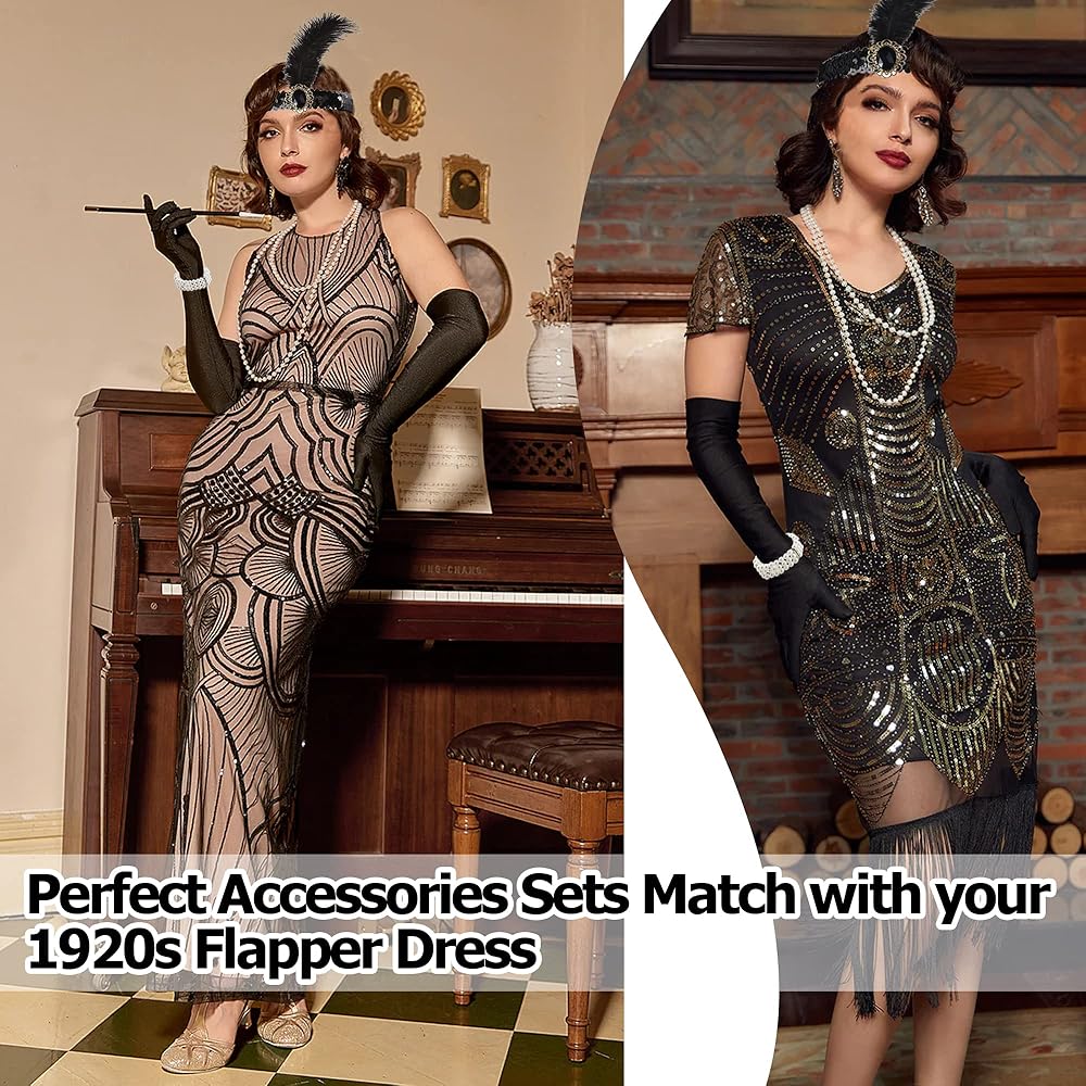 إكسسوارات أزياء غاتسبي للسيدات من عشرينيات القرن العشرين - مجموعة من الإكسسوارات الرائعة من عشرينيات القرن العشرين للحفلات الراقصة، وأزياء الزعانف، وحفلات عشرينيات القرن العشرين، والحفلات التي تحمل طابع غاتسبي العظيم، والأزياء التنكرية، وحفلات الفساتين الفاخرة، وحفلات آرت ديكو وجميع الحفلات الأخرى بأسلوب عتيق.