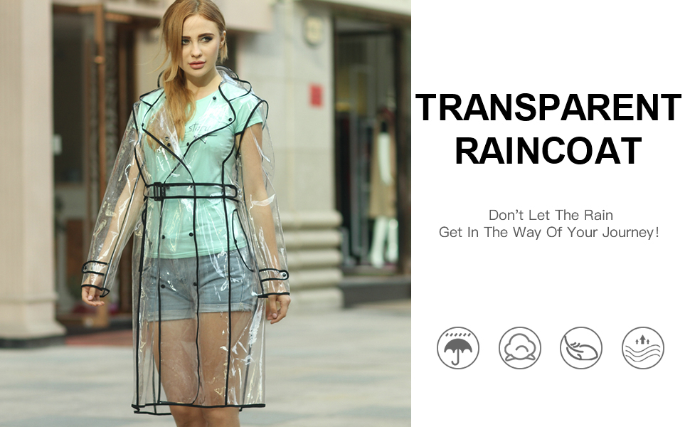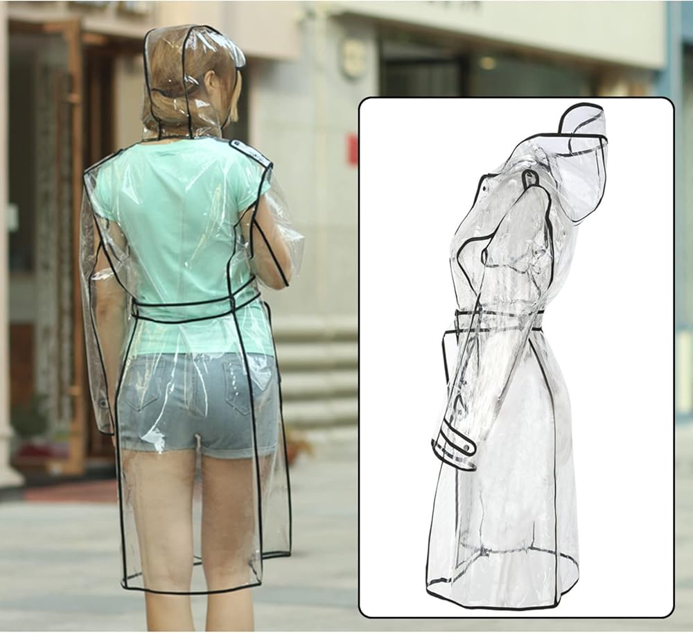 - النمط: معطف المطر الشفاف ذو القلنسوة طويل بما يكفي لتغطية ركبتيك، ويحميك من البلل عندما تمطر.
