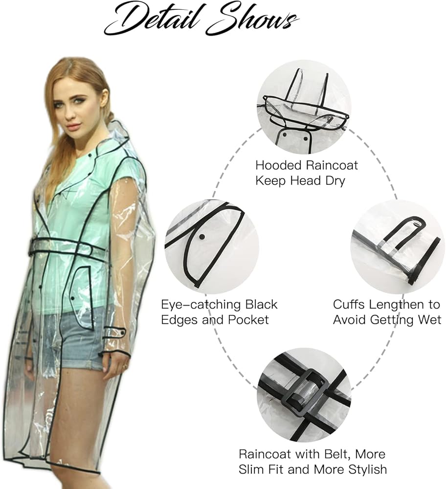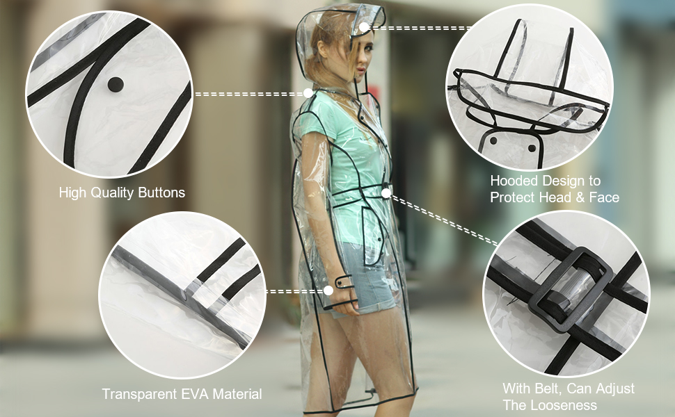 - التصميم: مادة شفافة بالكامل، مع تصميم غطاء محرك السيارة والحزام. يمكن سحب أطراف أكمام معطف المطر الشفاف المزودة بأزرار كبس وطيها لسهولة التخزين.