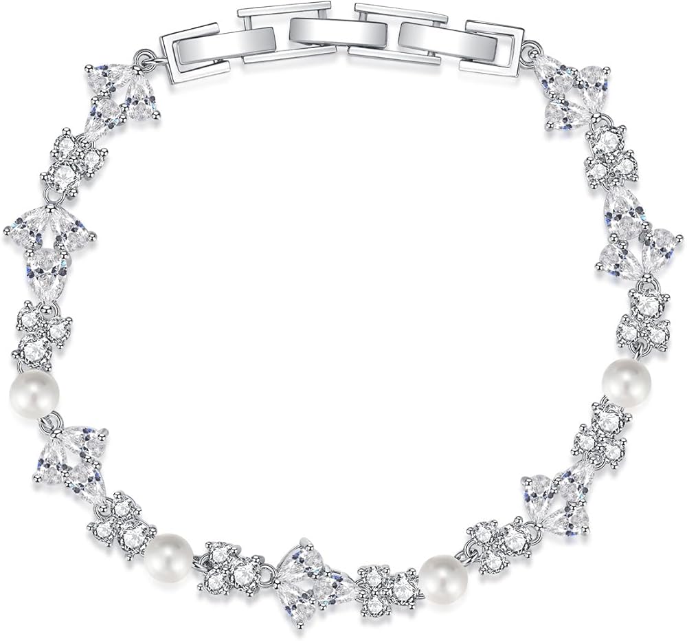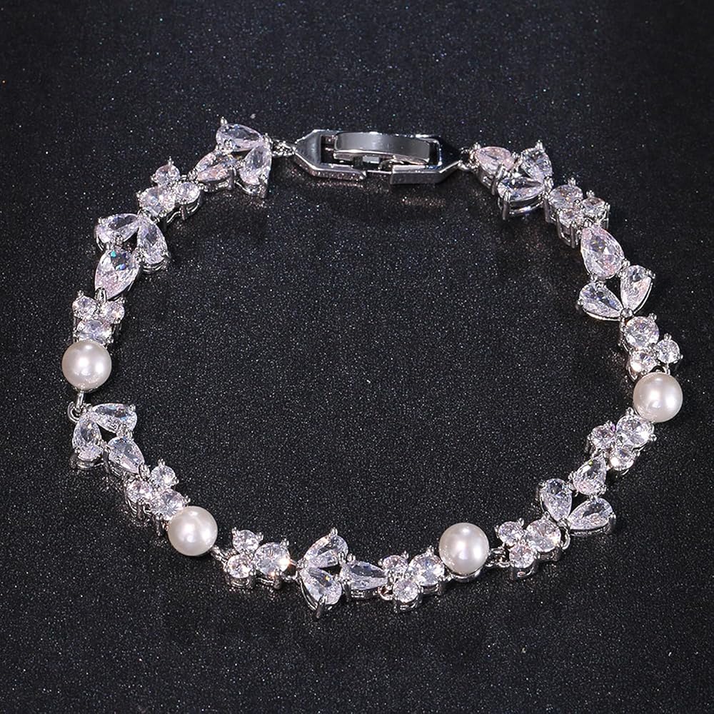 Hadskiss Tennis Bracelet for Women Brides, Rhinestone Silver Pearl Bracelet for Wedding Prom Party, Marquise Cubic Zirconia Bracelet for Costume Jewelry, 20cm, Copper, Cubic Zirconia