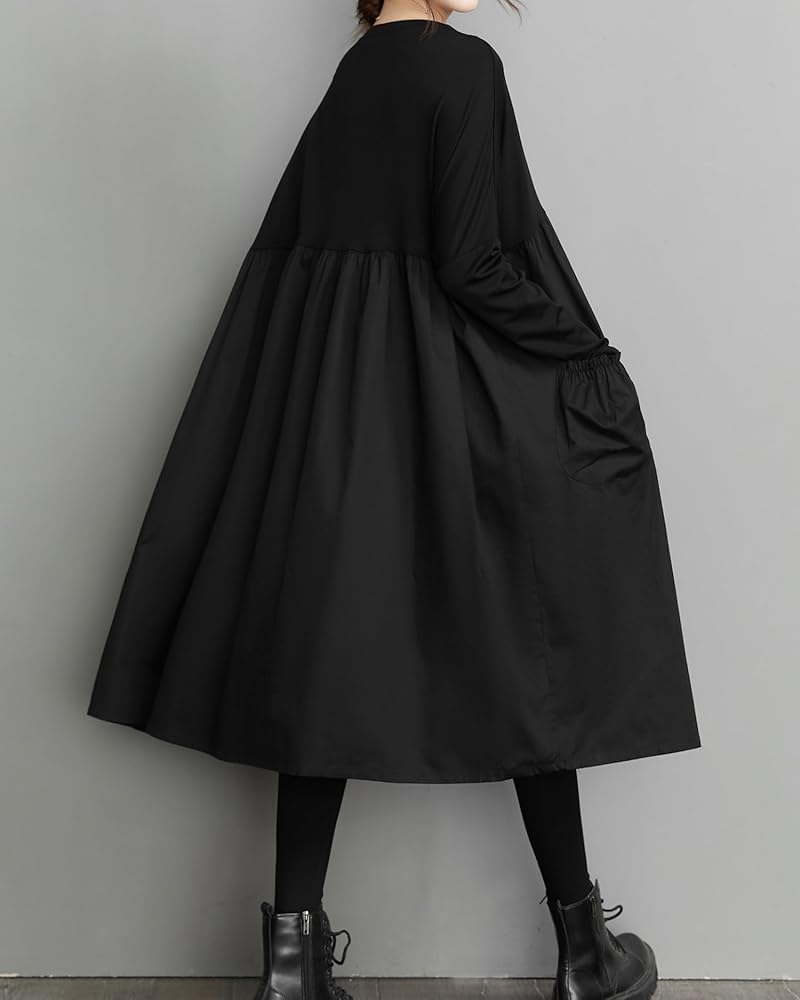 【التصميم】: احتضن الأناقة الخالدة مع التصميم الفضفاض على شكل حرف A، والذي يغري جميع الأشكال. يضيف خط الرقبة الدائري الكلاسيكي لمسة من الأناقة، بينما يخلق التصميم المرقع مظهرًا شبابيًا يتحدى الشيخوخة. يتميز بجيوب مريحة، وياقة دائرية، ويجمع هذا الفستان طويل الأكمام بين الأناقة والعملية.