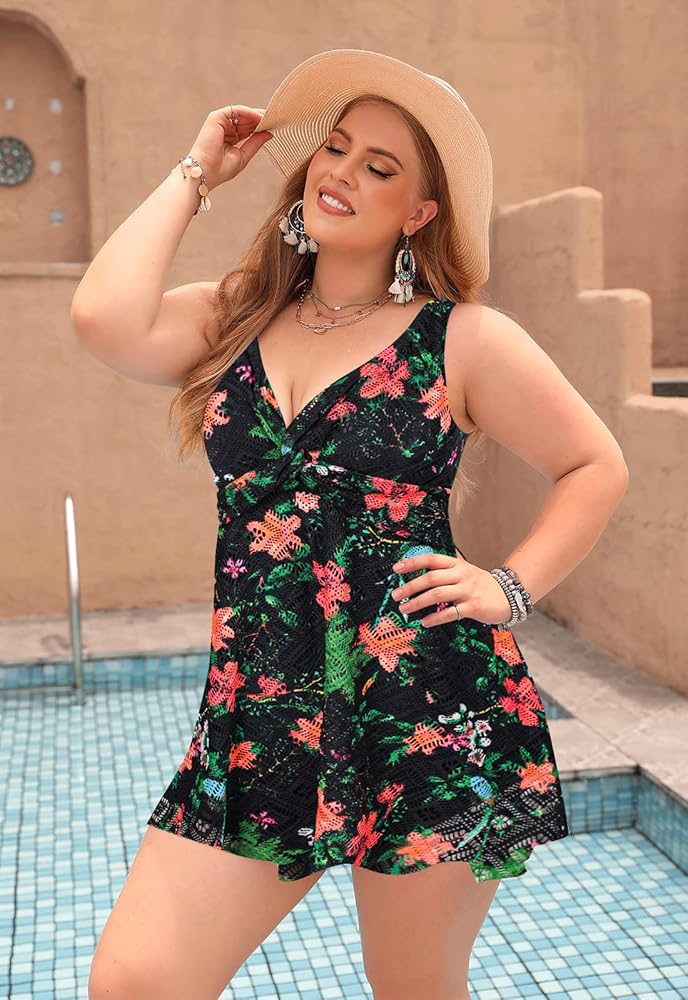 فستان سباحة مقاس كبير من ECUPPER للنساء ملابس سباحة متواضعة من قطعة واحدة ملابس سباحة دانتيل تنورة بدلة استحمام مع قيعان