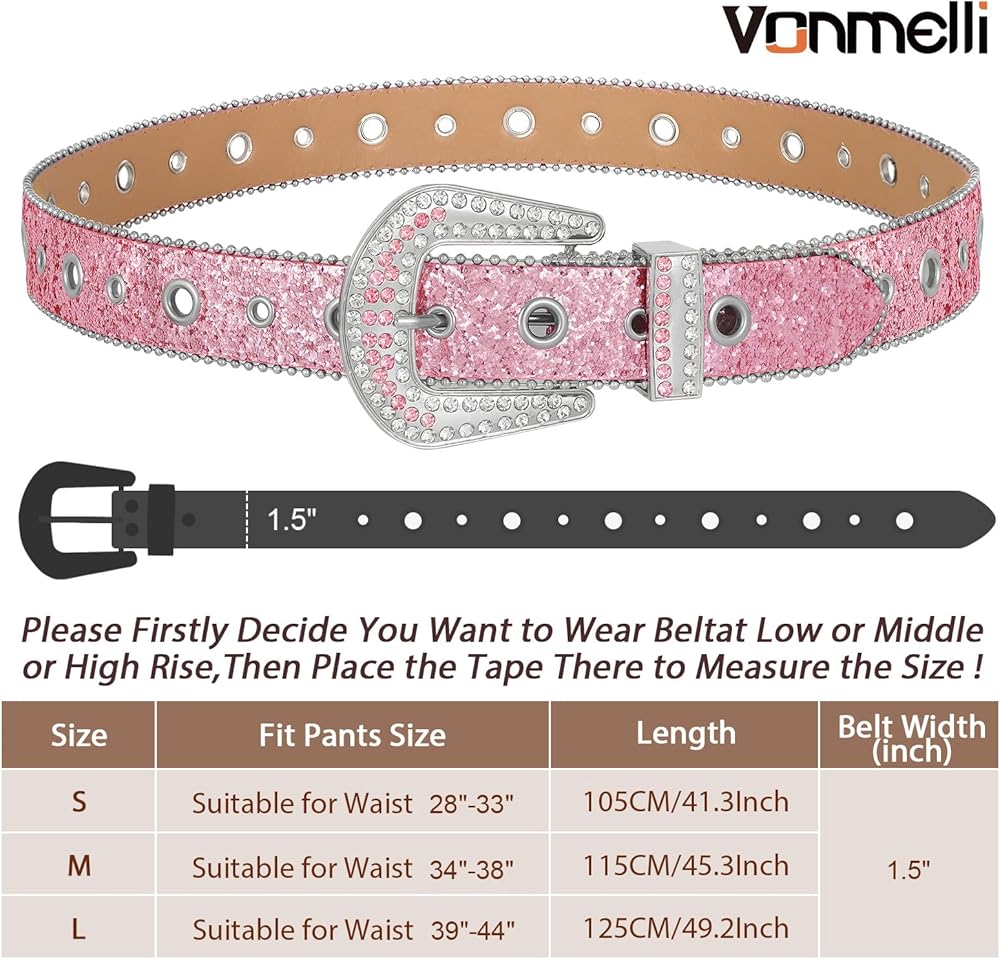 مقاس مريح - حزام حجر الراين للرجال والنساء مليء بالثقوب في كل مكان ويمكن تعديله حسب الرغبة وفقًا للاحتياجات. تتوفر ثلاثة مقاسات لاختيار أفضل مقاس. عرض الحزام هو 1.5 سم، وهو مقاس مناسب لسهولة الانزلاق داخل حلقات حزام سروالك، وليس ضخمًا جدًا.