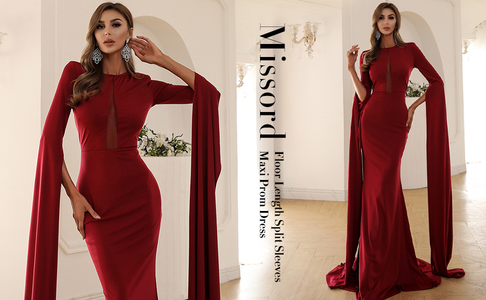 يتميز فستان الحفلات الفريد هذا بأكمام طويلة للغاية وحاشية على شكل حورية البحر، وشبكة متباينة في وضع الصدر، وشكل ضيق مع مقاس نحيف يظهر منحنياتك اللطيفة.