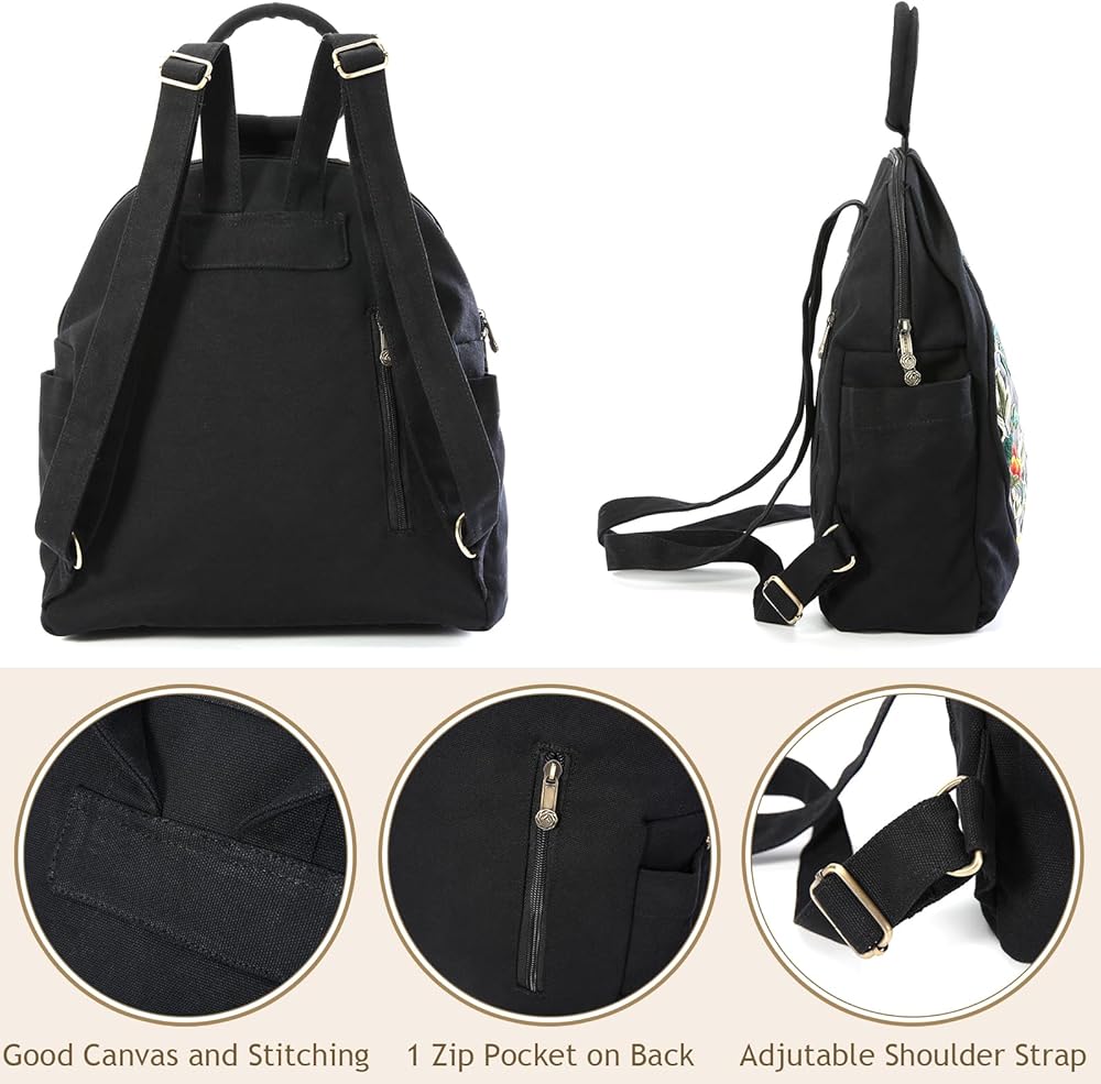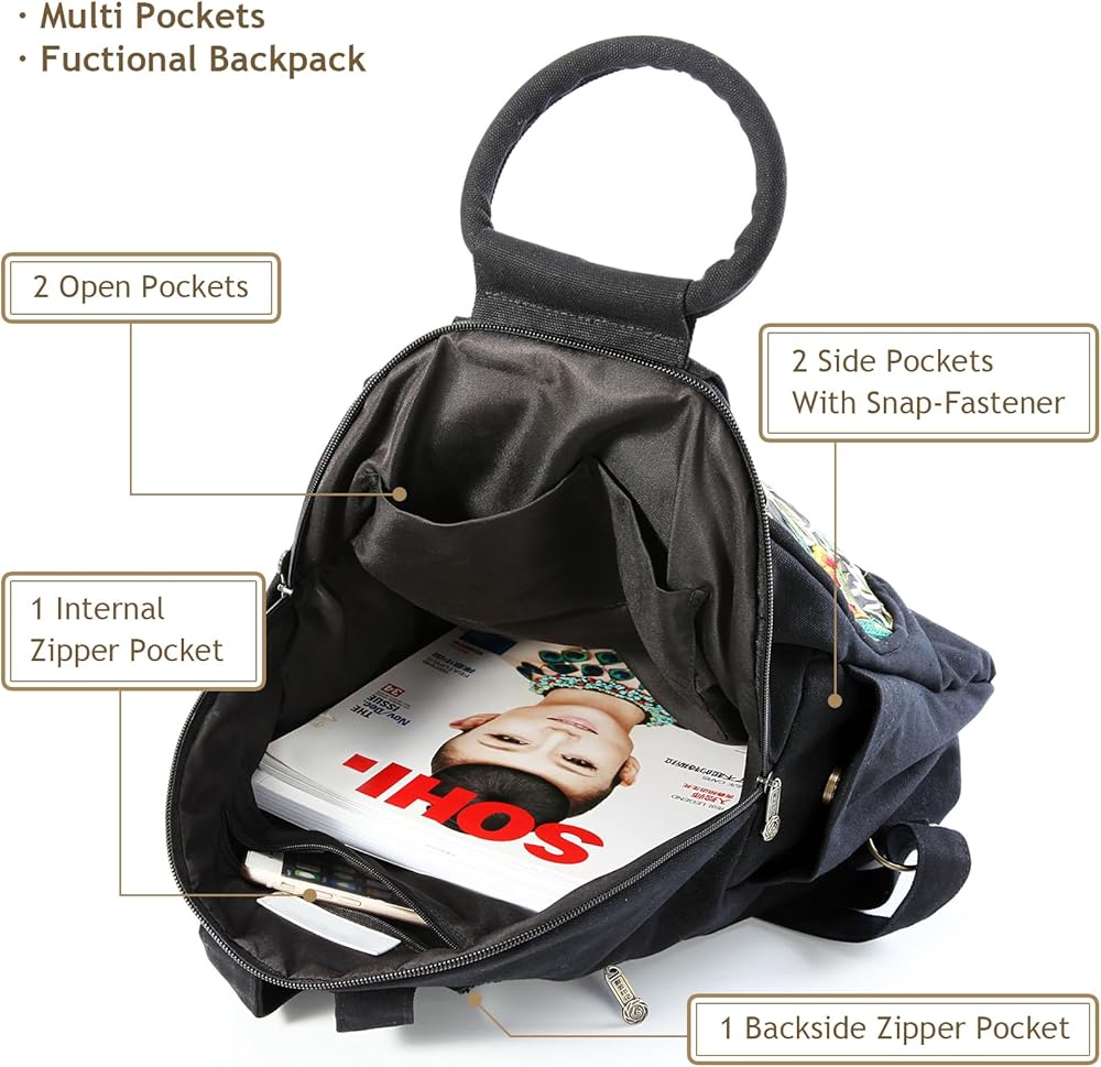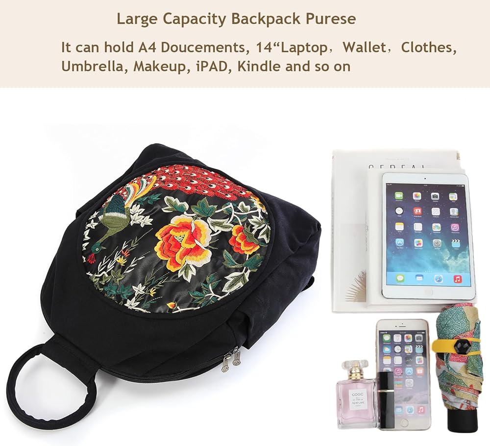 حقيبة ظهر كاجوال عصرية مطرزة بنمط فينتاج للنساء، حقيبة ظهر للسفر من القماش حقيبة كتف حقيبة يد